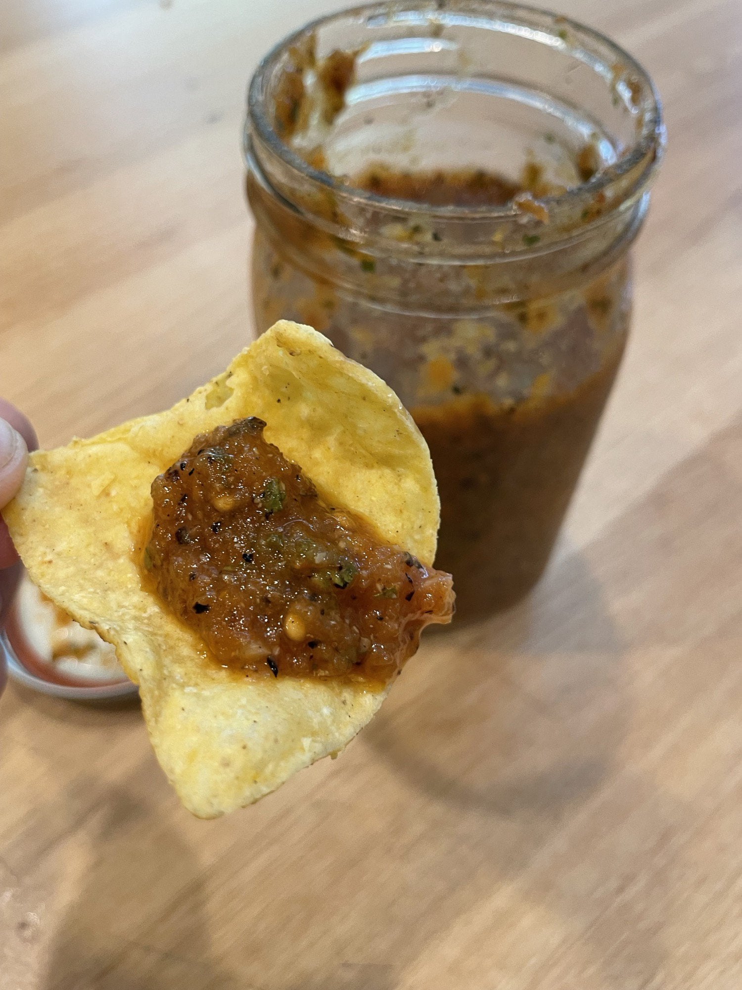 planty_pete 3 years ago I charcoal grilled 3 Roma tomatoes, 1 big orange heirloom, 2 jalapenos, 4 cloves garlic, and half a giant sweet onion. Blended with juice from 3 limes, cilantro, and salt and pepper. It’s very sweet and has a spice that builds up.