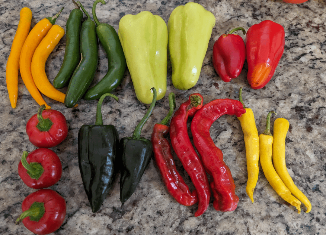 Hungarian yellow, Serrano, Gypsy, ?, Cherry, Poblano, Cayenne, Wax