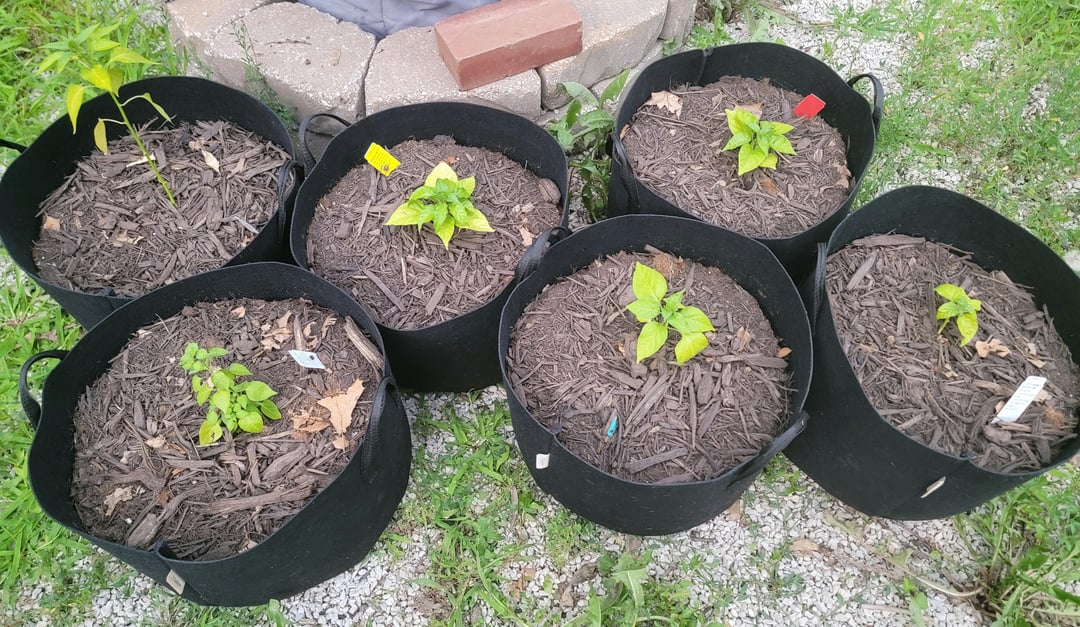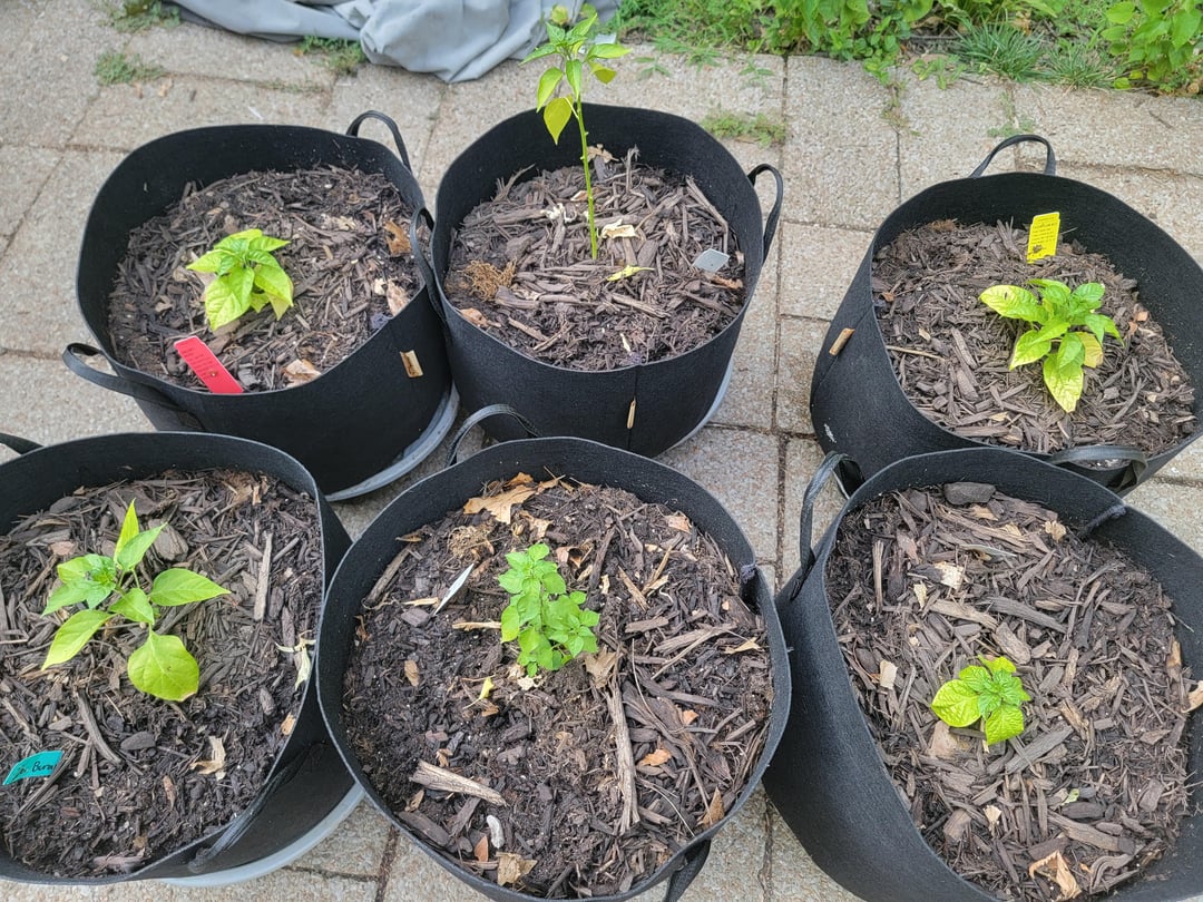 Ordered as saplings from chiliplants.com. I let them rest for a few days before planting into 7 gallon planting bags (first year using bags and 7 gallon size pots). I used organic soil and a bit of mulch on top. I use fish emmulsion ferilizer about once a week. The first couple weeks of June were wetter than usual… i brought them inside and left them under an umbrella a couple times. Now were about a month in and a few have barely budged. Leaves seem yellow, a few have fallen off. House faces North but neighbor trees prevent them from gettin earlier and later sun. Most of the day they get full sun