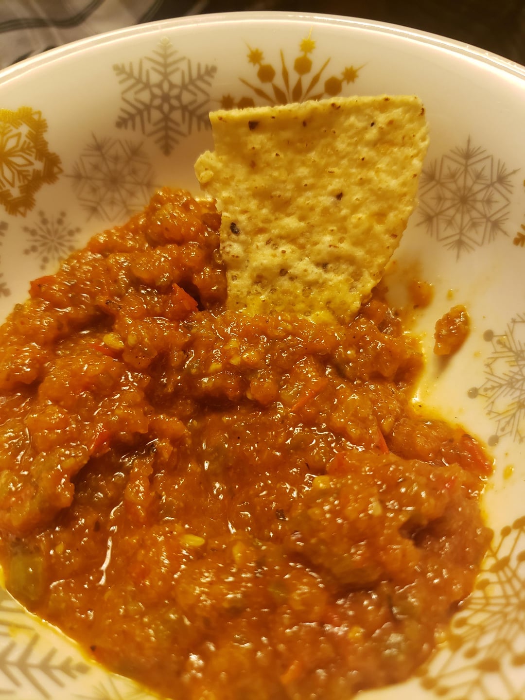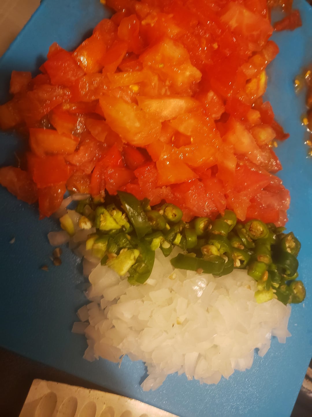 My tomatoes are faster than peppers, but above veggies(Boxcar Willy 🍅, White onion) blended with garlic powder, cumin, paprika, salt, pepper. And some dried cayenne from last year. I usually like more hot but needed to use tomatoes. First time growing and cooking with fresh tomatoes.