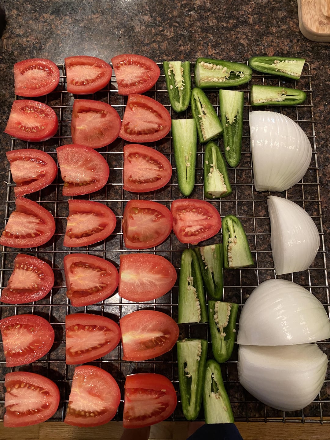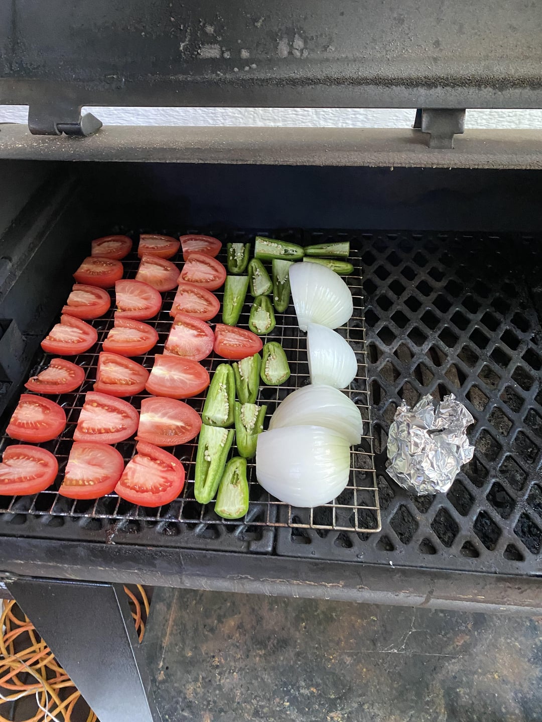 Following Meat Church BBQ recipe Smoked Salsa- Hickory Pellets at 200° for 2 hours, 11 tomatoes, 7 jalapeños, 1 large white onion quartered, 1 head of garlic (wrapped), juice of 3 limes, and a handful of cilantro
