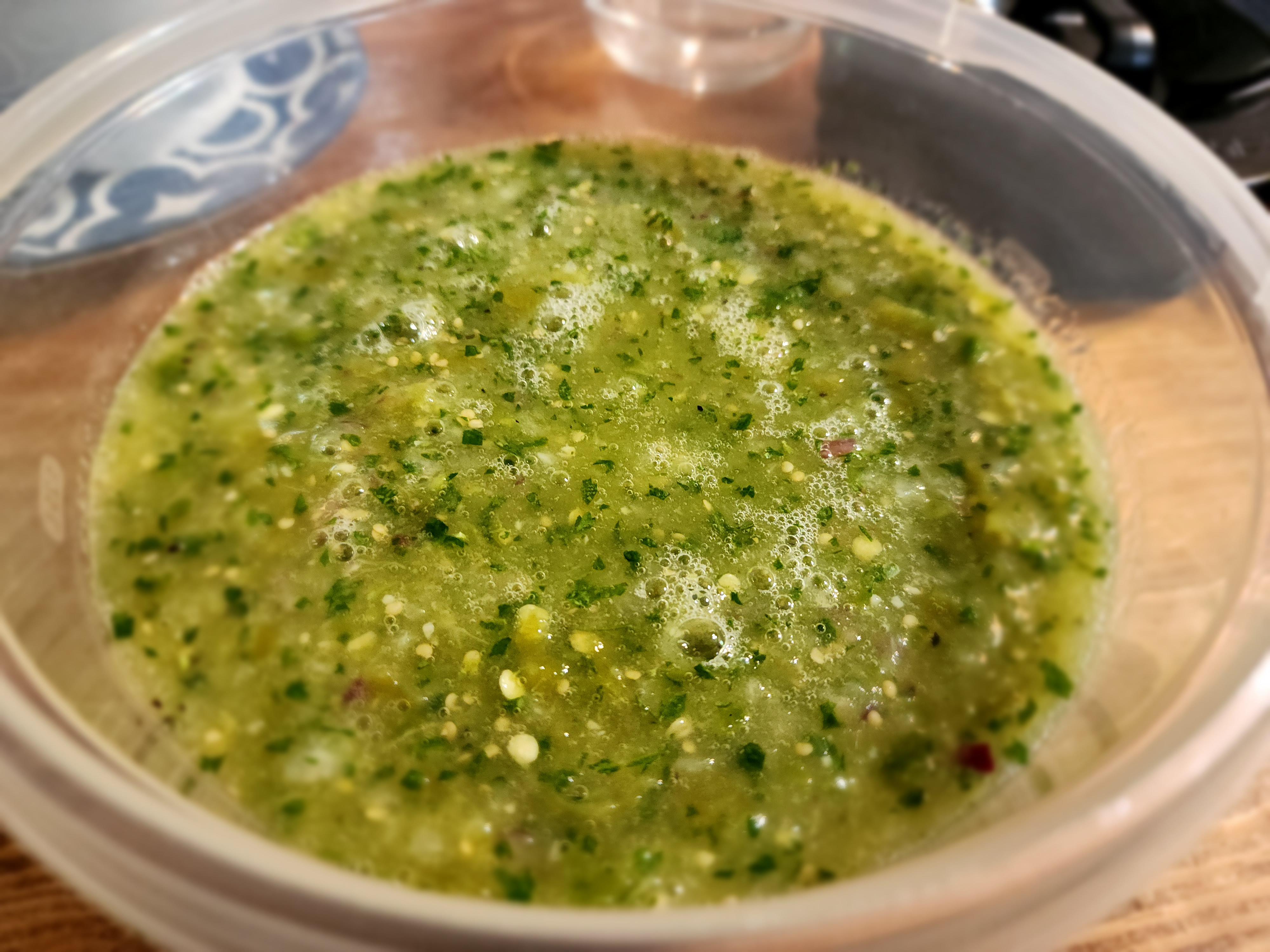 In blender combine tomatillos, peppers, seasoning, cilantro and onion and blend until desired consistency