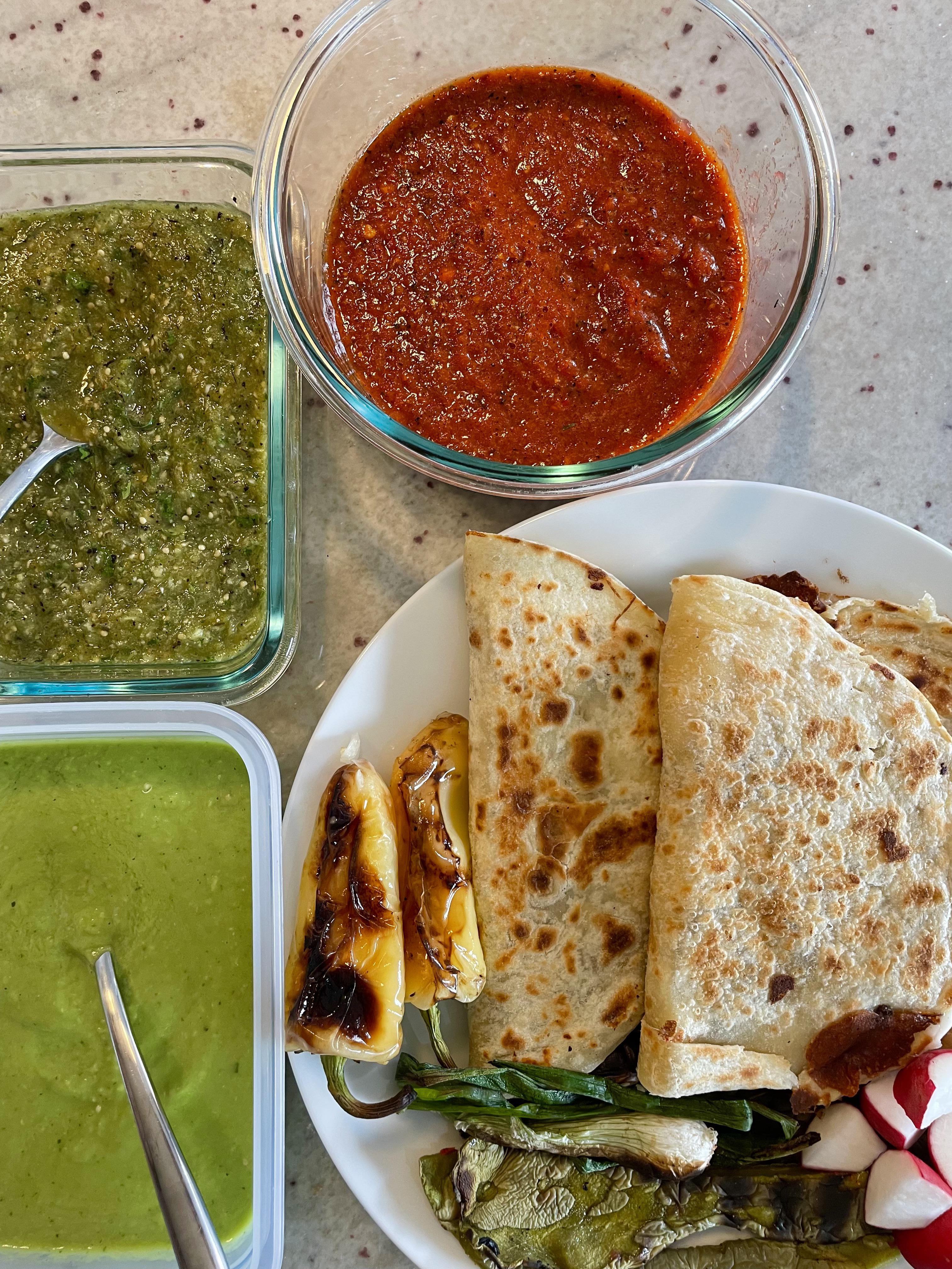 super-stew 3 years ago Red: charcoal-roasted tomatoes, red jalapeños, and garlic. Random chili powders, salt, MSG, black pepper, Mexican oregano, lime.Green: charcoal-roasted tomatillos, serranos, spring onions, and garlic. Cilantro, salt, MSG, black pepper, sugar, Mexican oregano, lime, water.Very green: avocado, tomatillos, serranos, cilantro, lime, water, salt.Quesadillas: fresh flour tortillas, queso Oaxaca, charcoal-grilled carne asada and longaniza.Vegetables: Charcoal-grilled nopales, spring onions, and chiles gueros stuffed with queso Oaxaca. Radish on the side.