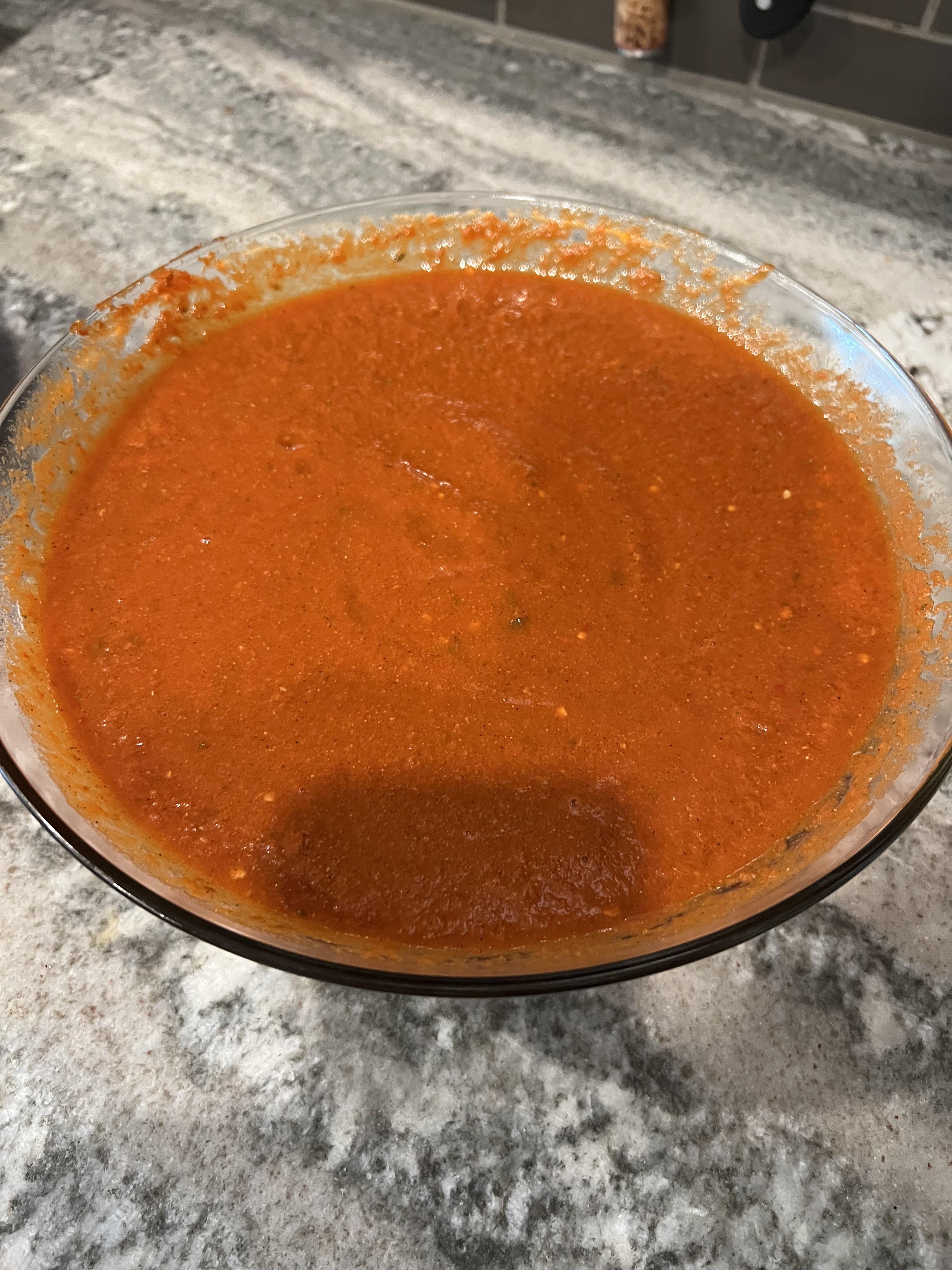 Sorry all I didn’t use any measurements. I used dried chilis to make what is called a chili sarta: New Mexico chilis, arbols, tepins. Boiled, then stepped until supple. Blended until smooth.