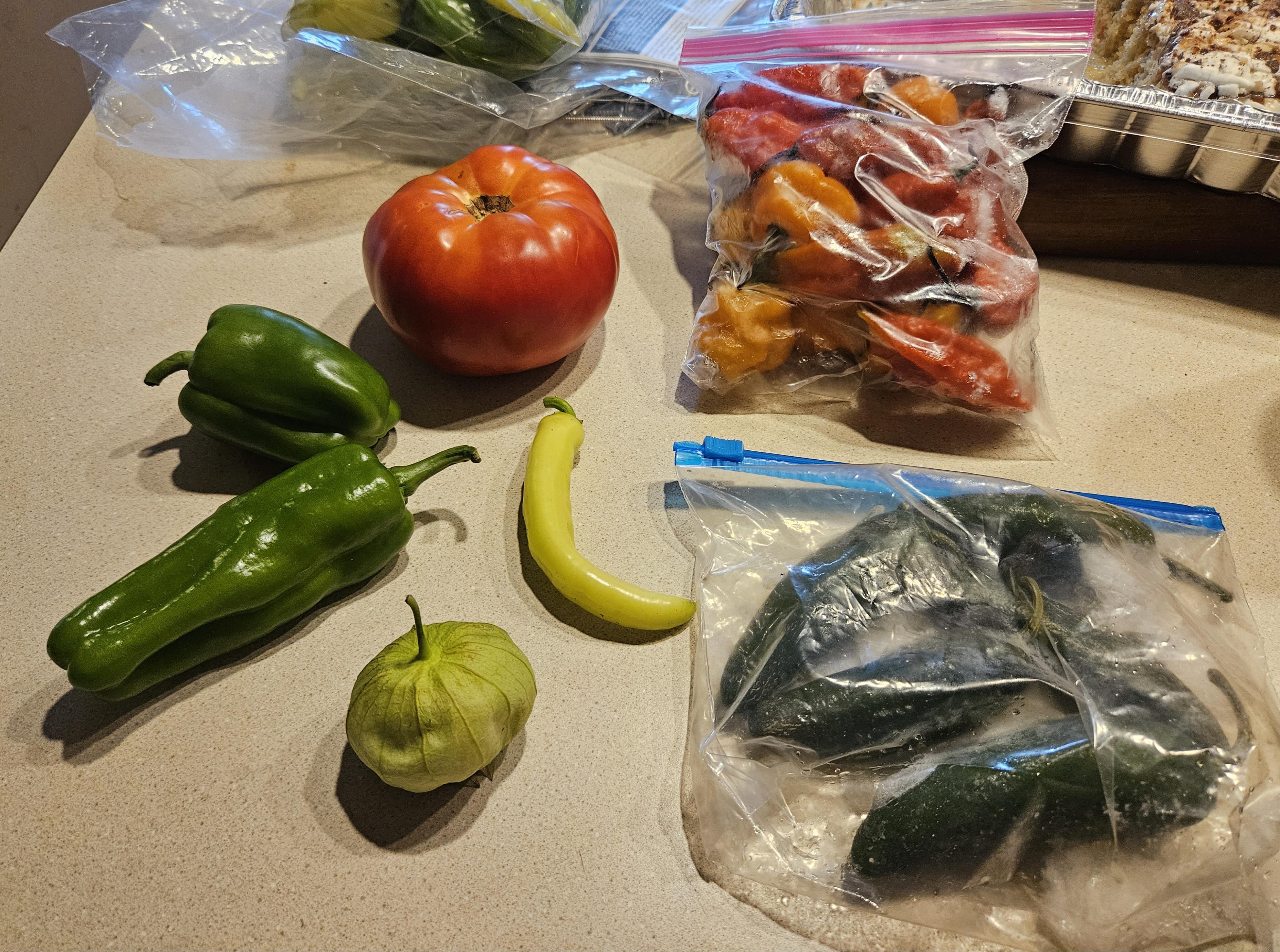 Veggies on the left are fresh, peppers in the bags are frozen from last year. Can I use the frozen peppers still? Are the green fresh peppers good for salsa? I’m a beginner.