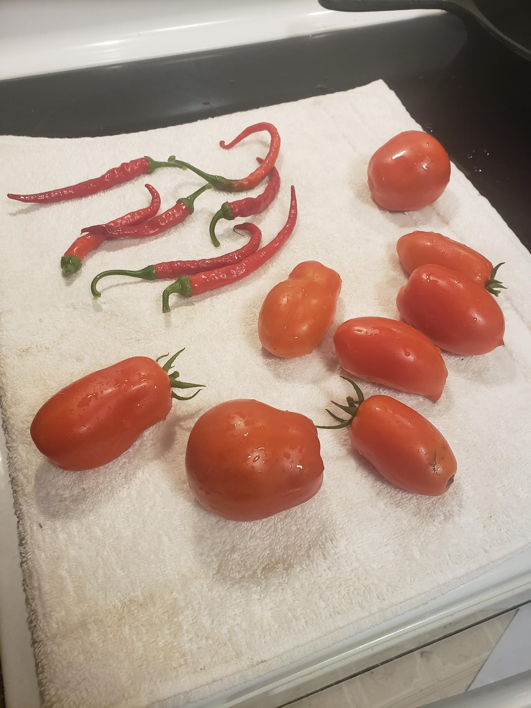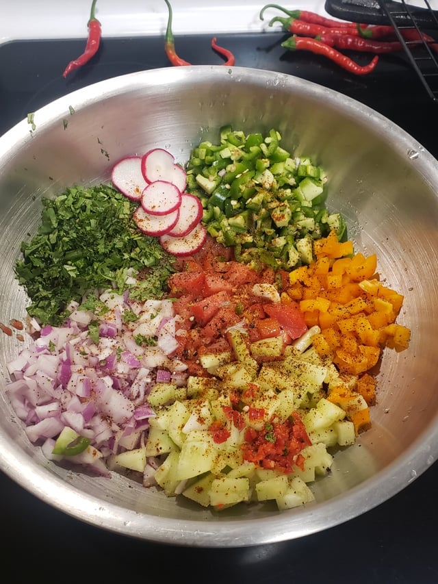 Red onion, cukes, cilantro, tomato, radish (only a couple and large enough for me to pick out!), orange bell peppers (first time trying these), jalapenos, lime juice, splash of vinegar, salt and pepper.