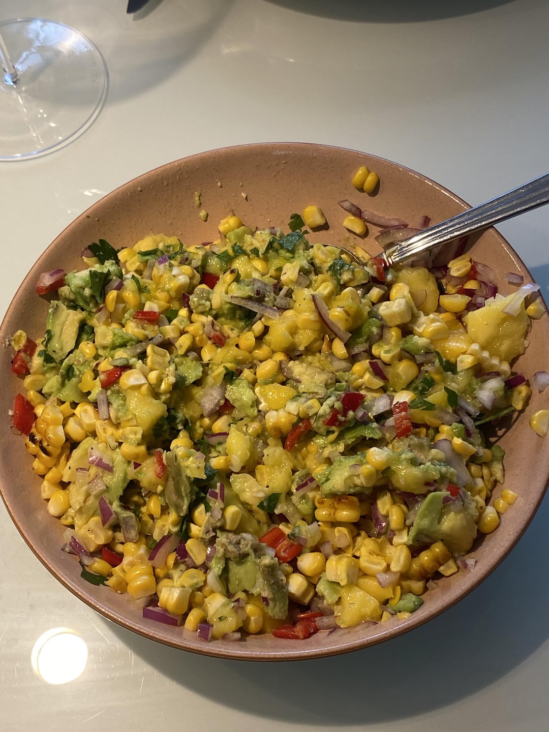 Grill two corn cobs; I did mine on the bbq. Dice one mango and two avocados. Put in a bowl with the roasted corn kernels. Add half a red onion, one red chilli, juice of a lime, salt, pepper and parsley. Enjoy!