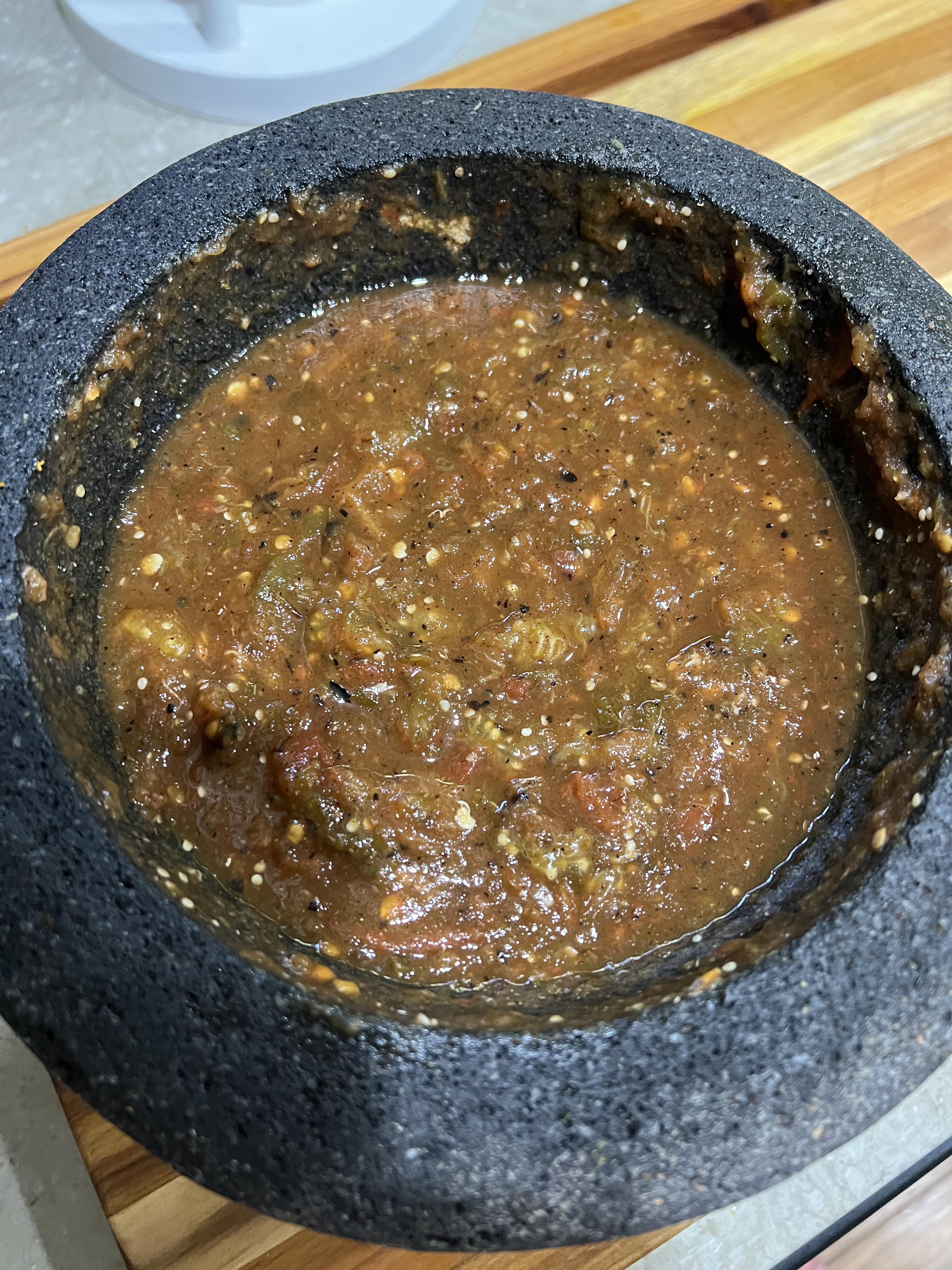 4 Roma tomatoes, 4 tomatillos, 2 jalapeños, 1 Chile de arbol, 1 guajillo, 4 garlic cloves, 1/2 onion. It’s flavor is very deep and rich, but could use more brightness. Not enough tomatillos.by qtipdbc1 pico de gallosalsaSauceWrite A CommentYou must be logged in to post a comment.