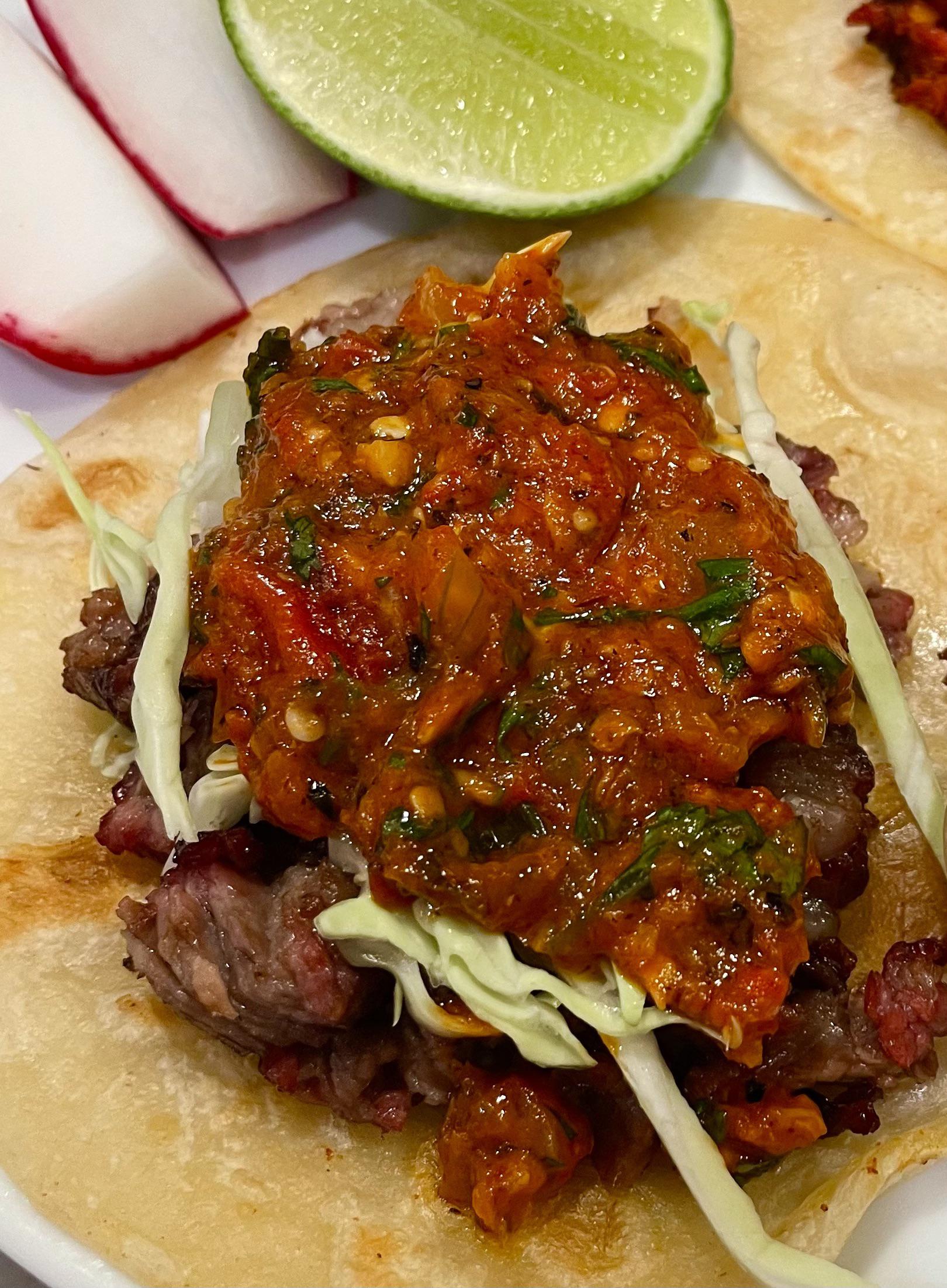 Mesquite-grilled bone marrow / fresno chiles / spring onions, sautƩed garlic, salt / MSG / black pepper, and pinches of Mexican oregano / allspice / cumin / coriander. Roughly blended, heated in a pan with a bit of water, and added cilantro right before serving.