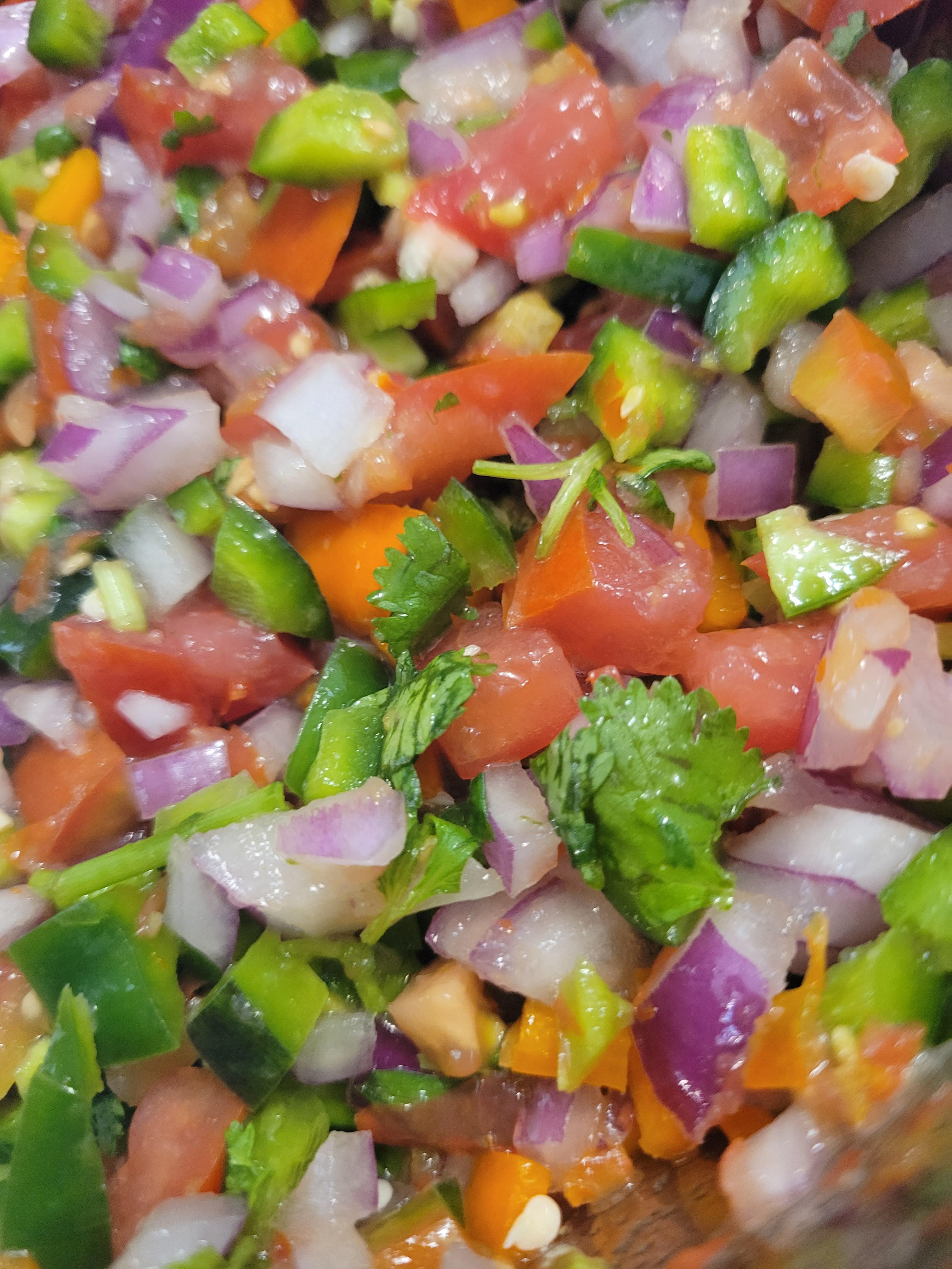 Black beauty tomato 1 Heirloom beefsteak Roughly 15 cherry tomato 2 whole jalapeño 2 orange habanero 1 red onion 4 cloves garlic Juice of 2 limes+zest Cilantro Salt/pepper/cumin