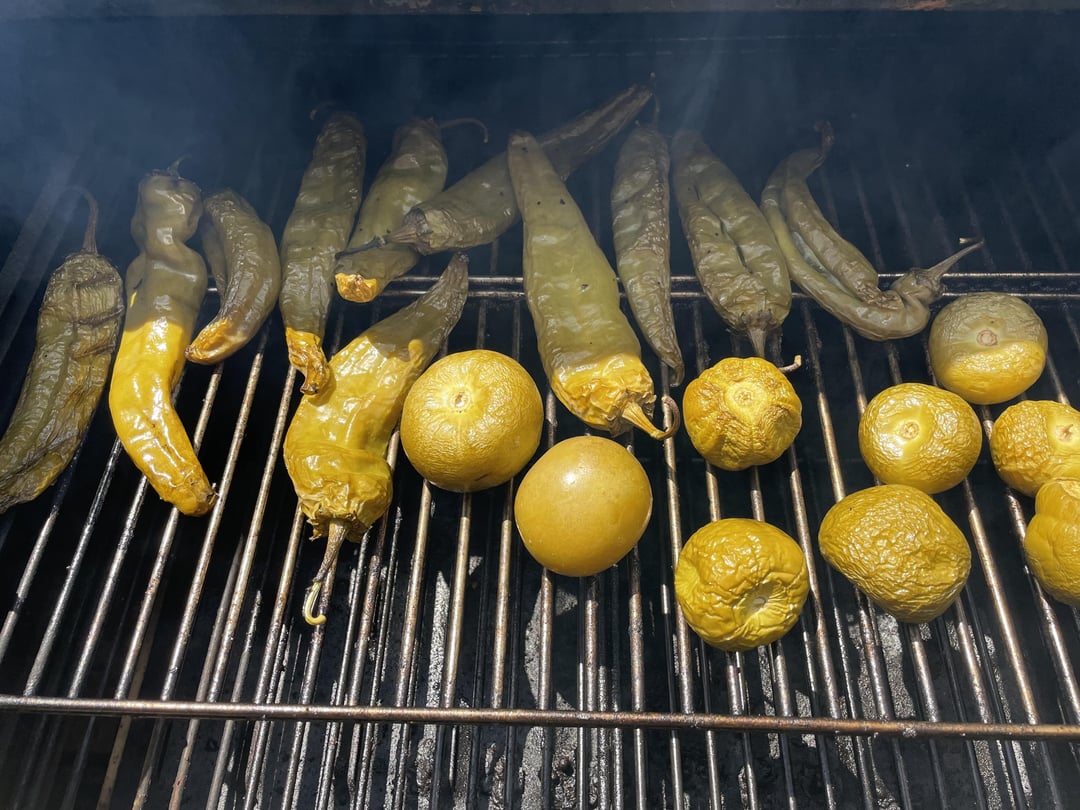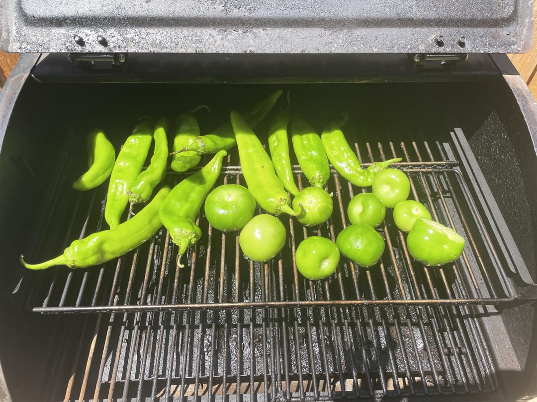 1. Set smoker to 225-275. Cut a slit in each green chile so it absorbs more smoke. Husk tomatillos (wash if your heart desires). Toss green chiles and tomatillos with oil to lightly cover the outside to allow for more smoke flavor (smoke likes fat).