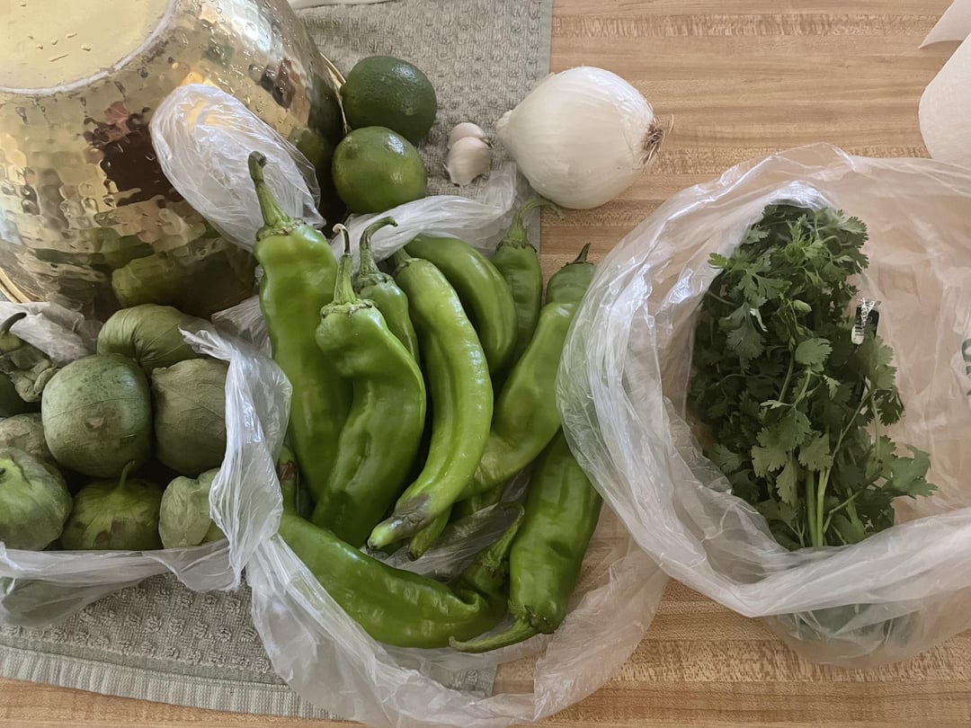 * Dozen fresh hatch green chiles * 8 tomatillos * 1/4 white onion * 2 cloves of garlic * 2 limes, juiced * Handful cilantro * Salt * Water * 1 T Neutral oil