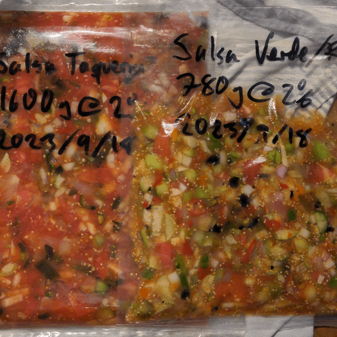 Half of the produce for each salsa is roasted in the oven until charred. Chop raw and roasted produce in small pieces and combine in a bowl. Add 2% salt for the total amount, mix well and transfer to vacuum bags.
