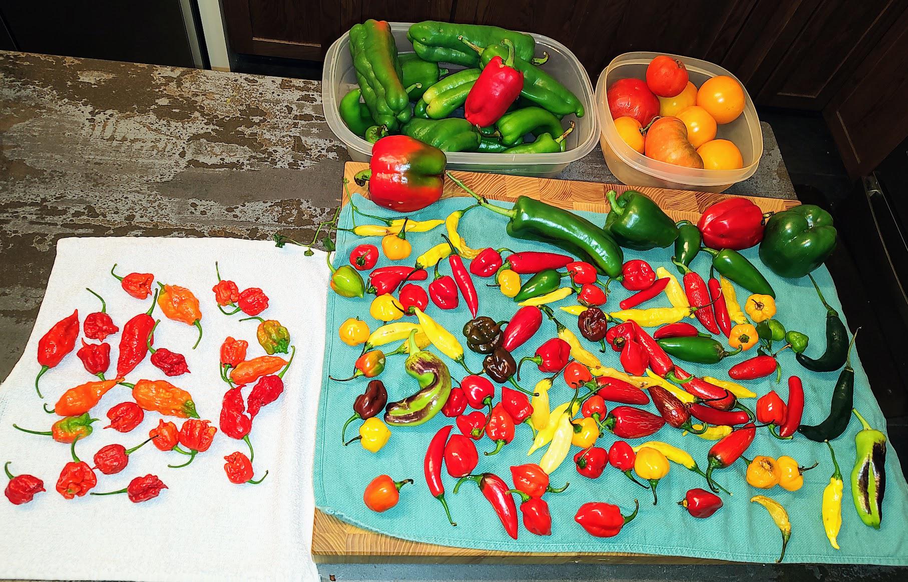 A friend of a relative gave us a bunch of home-grown stuff. A few tomatoes, and a LOT of peppers. I was warned that the ones on the white towel are ghost peppers, although I suspect some may be reapers or scorpions.