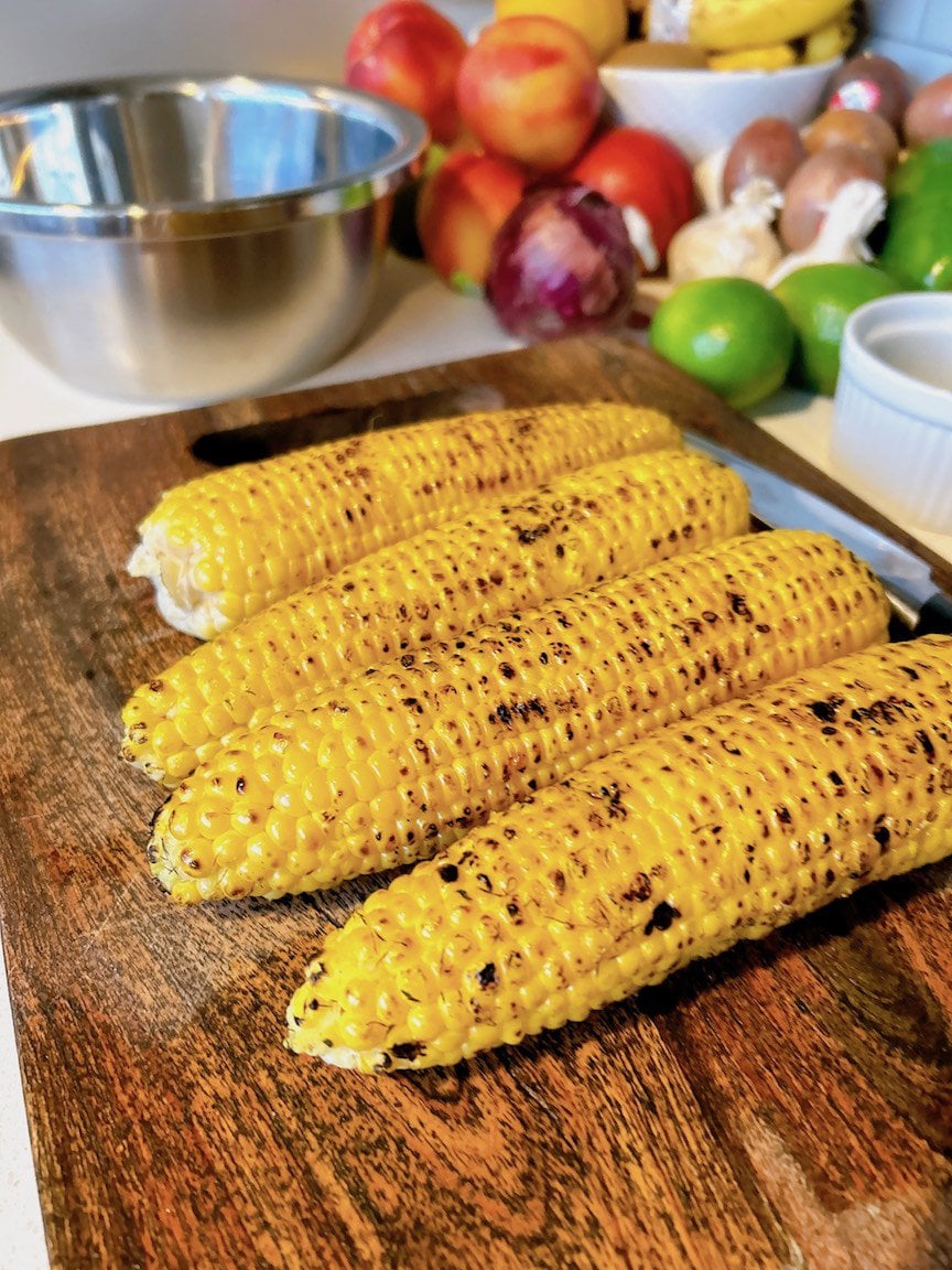 4. Remove the charred corn from the grill and let it cool for a few minutes. Once cooled, carefully cut the corn kernels off the cobs and transfer them to a mixing bowl.