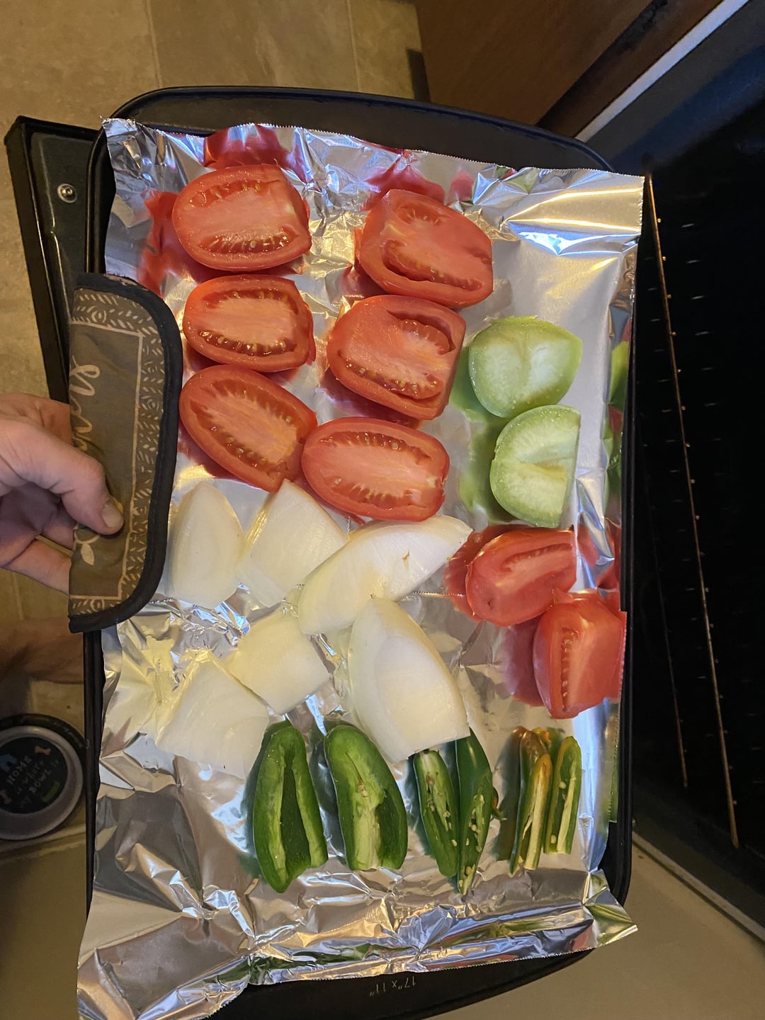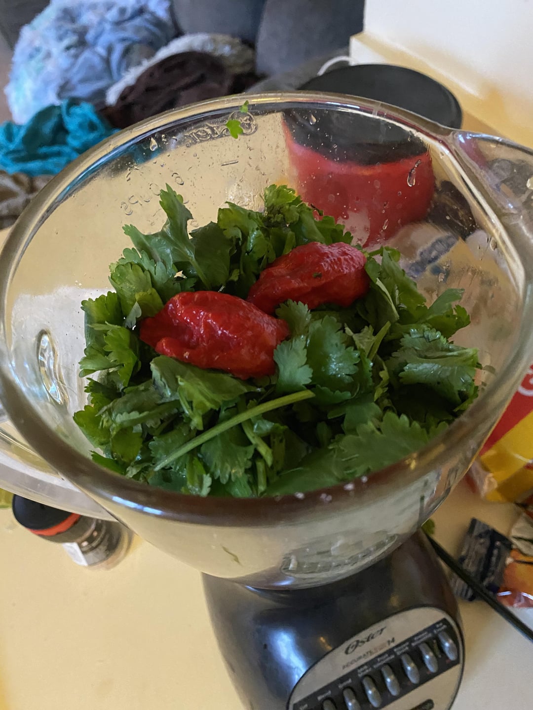 4 Roma tomatoes 2 tomatillos 1/2 a sweet onion 1 whole clove garlic Sea salt 1 whole squeezed lime 1 bunch cilantro 2 Serano peppers 2 jalapeños 1 Carolina reaper (no seeds)