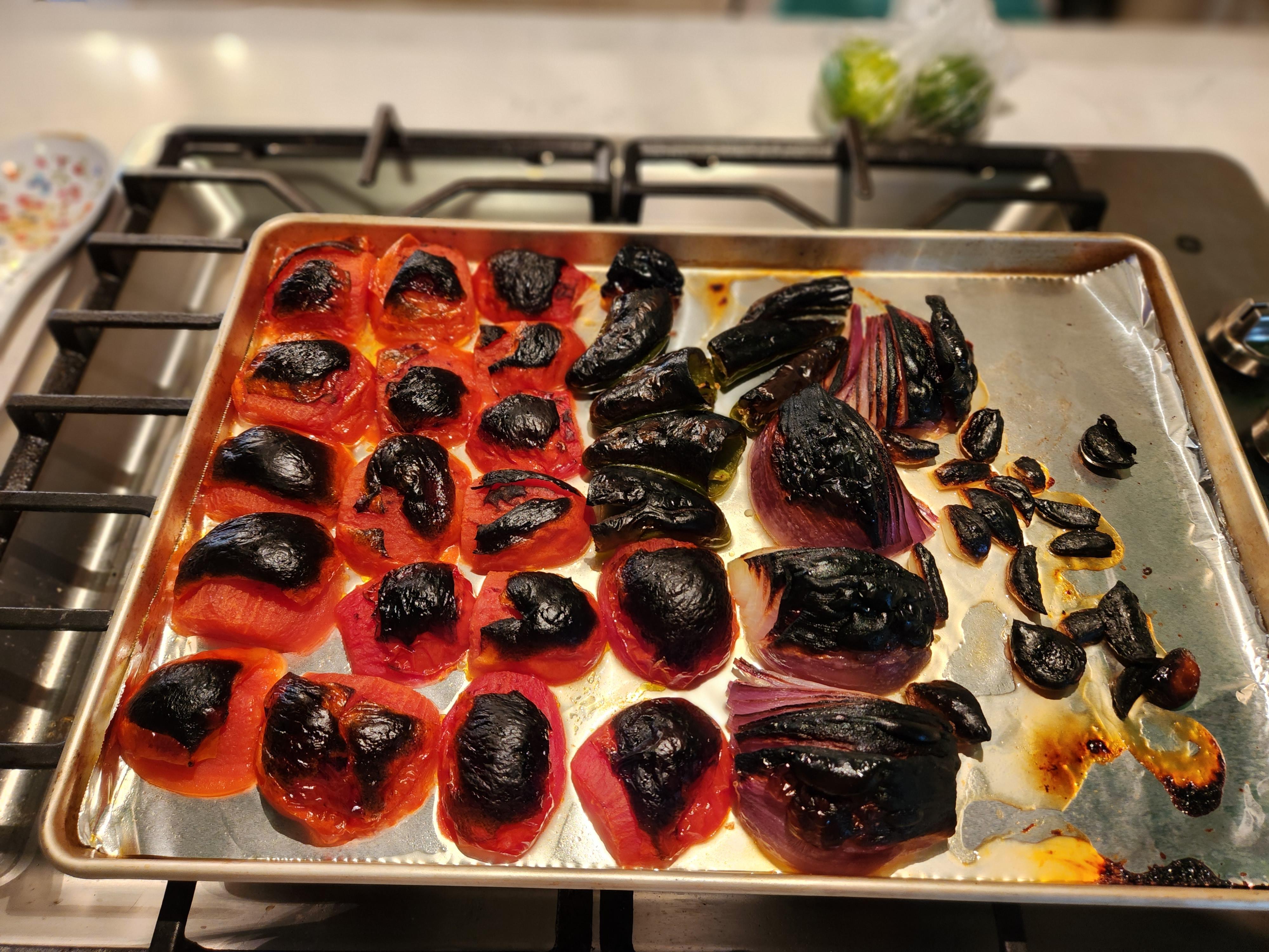 I prefer to roast my garlic in a ball of foil with some oil specifically to prevent any charring or over caramelization. Tomatoes look perfect, that’s how they do “fire roasted” salsas