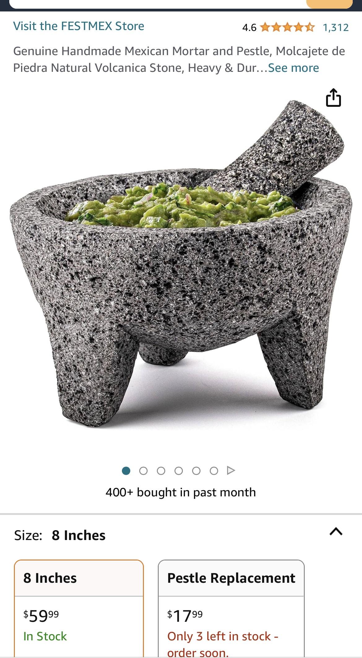 8. I have a couple of [molcajetes](https://i.imgur.com/ObCsUPT.jpg), and the one you are looking at is [my favorite.](https://i.imgur.com/YUFCt5q.jpg) I ordered it from Amazon from that seller as I live in a small city with a healthy population and 5 Mexican groceries within 5 minutes of my house, and none sell molcajetes. I’ll note though, that it was over $20 cheaper when I bought mine. I paid $36.99 plus tax for mine.