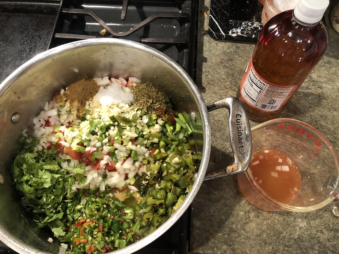 Chopped tomatoes, peppers, garlic, cilantro, oregano, salt, and cumin. Add in apple cider vinegar and simmer down.