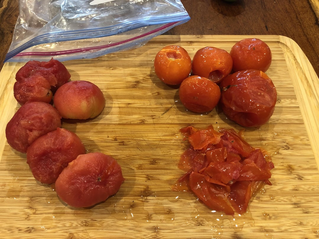 >Sometimes if I have extra tomatoes, I core them and freeze whole. When u defrost the skins slip right off-use for things like salsa🤣