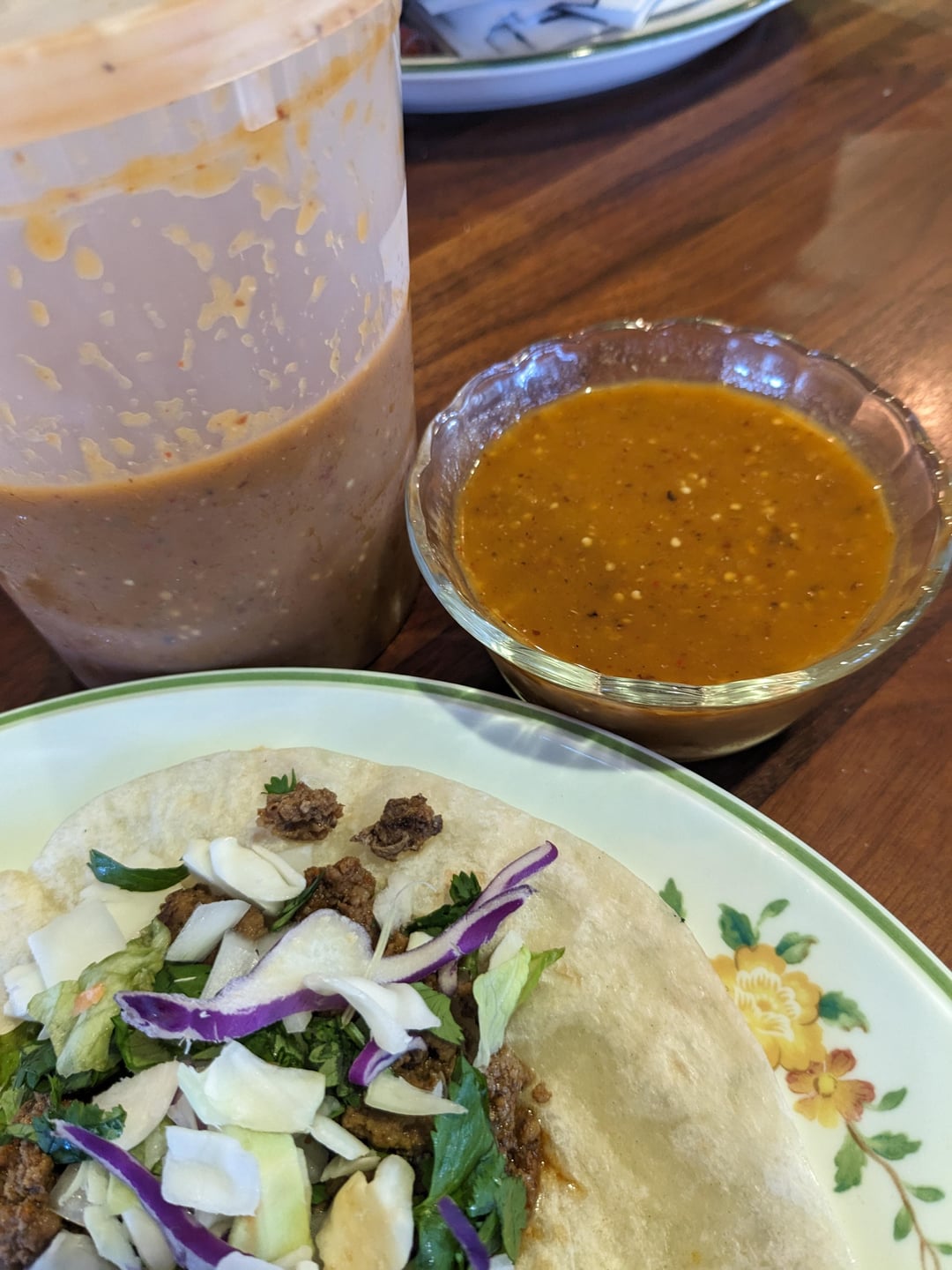 I have not been able to come close to recreating this and they are very tight-lipped (and English challenged), and I haven’t been able to get them to give me any clues. This salsa is not like any others I have tasted. The temperature varies a lot, it doesn’t seem to have any tomatoes in it. I’m guessing tomatillos, reconstituted dried peppers of some variety, cilantro, garlic, and other mystery ingredients.