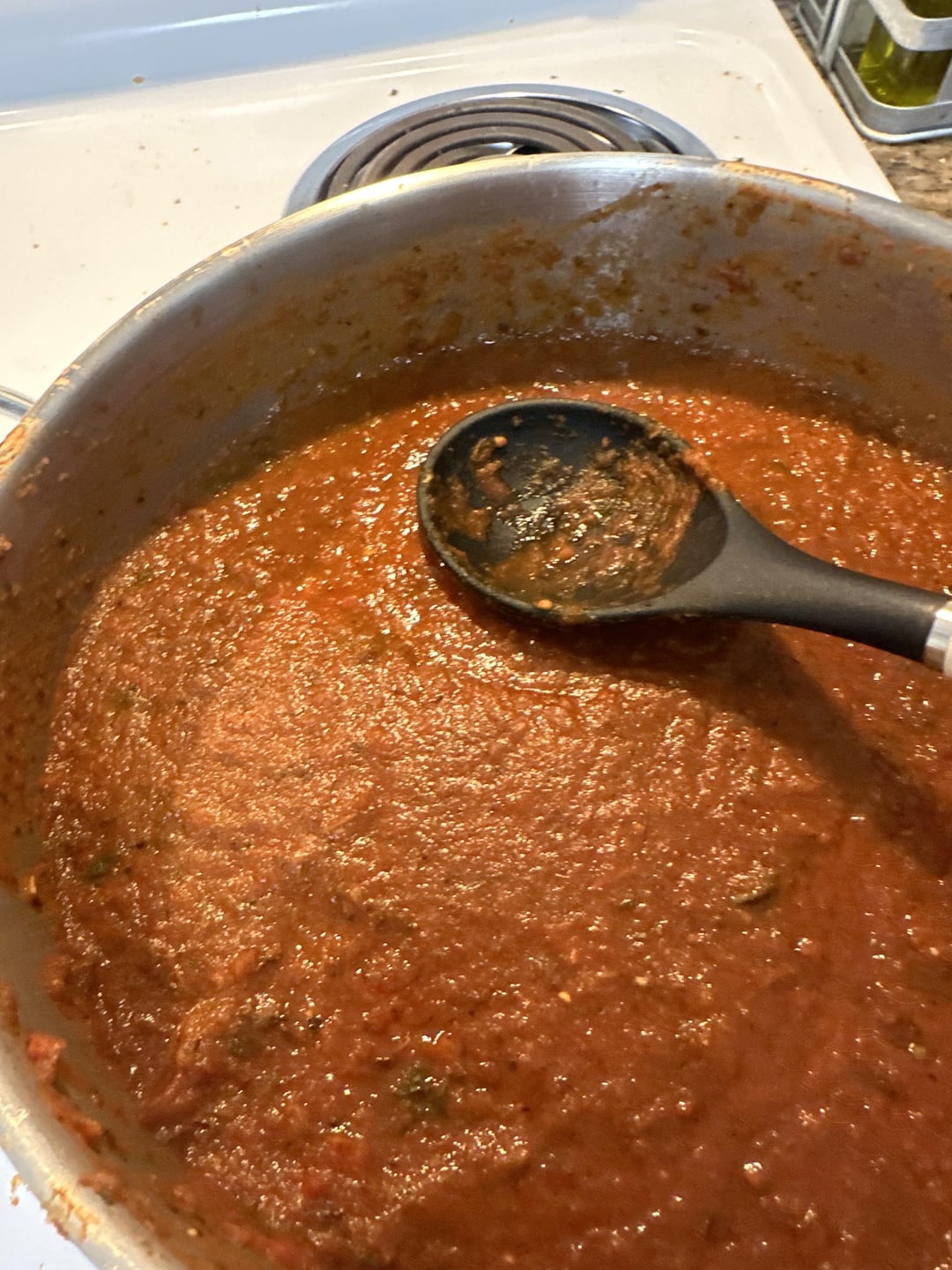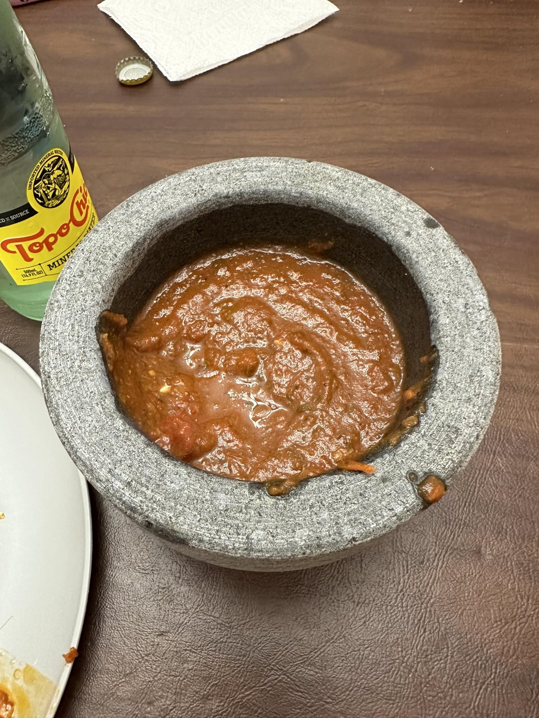 I wanted something like El Tiempo salsa roja in Houston, TX. For this recipe I roasted the tomatoes, chopped onions, Serrano, jalepeno, and haberno under a broiler. For the ancho and guajillo peppers, I dry roasted them in a skillet for awhile and then boiled them in water. I blended these peppers up separately with some faucet water so it was less of a paste. I blended up the tomatoes, onion and other peppers in the blender and put it on a pot to simmer out. Similarly, I mashed down the salt, cilantro, and garlic in a Molcajete and mixed that into my salsa. I started to spoon in some of the ancho and guajillo pepper paste I made, to give it some more heat. I may have put too much Mexican oregano in there… but it has a good flavor despite being my first time making salsa. I might try chipotle peppers in adobo salsa next time or try smoking my ingredients.