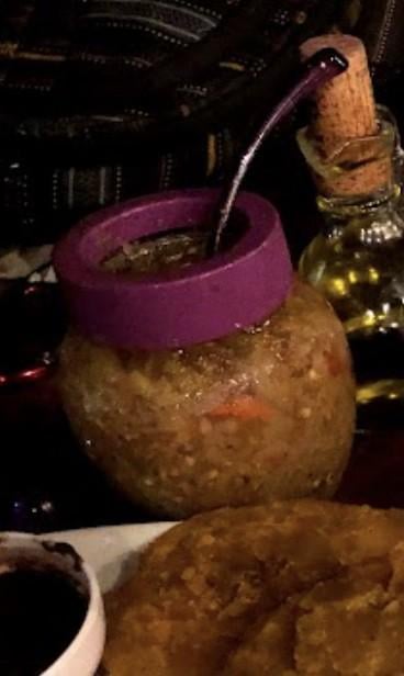 I only have this one photo, to try and show the texture better. It was fairly chunky, but the liquid was runny and sort of separated from the veg until stirred. Strong acidic flavor and definitely spicy. Almost like a finely chopped/blended giardiniera. Our table put it on everything and went through two bottles!
