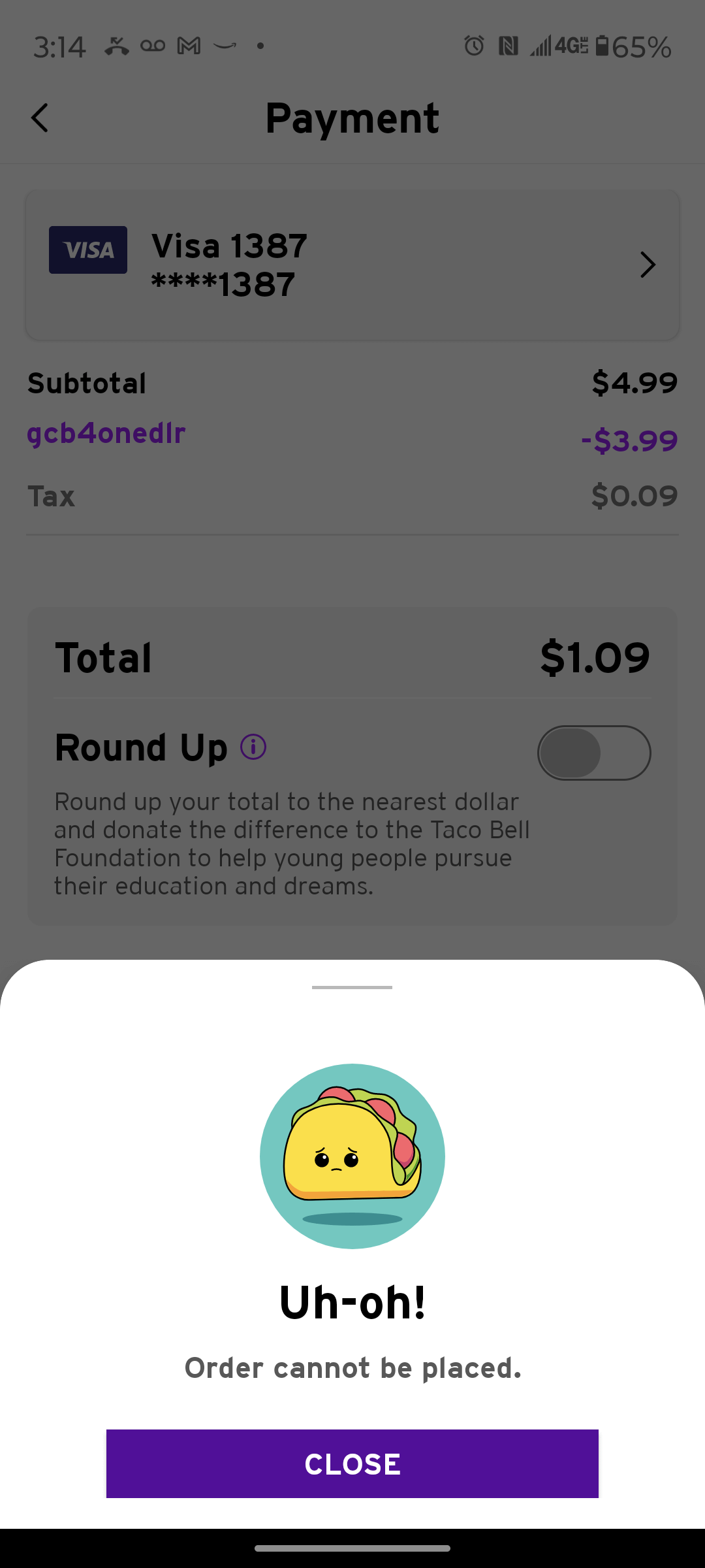 Tried for 10 minutes by No-Raisin-6469 taco bellWrite A CommentYou must be logged in to post a comment.