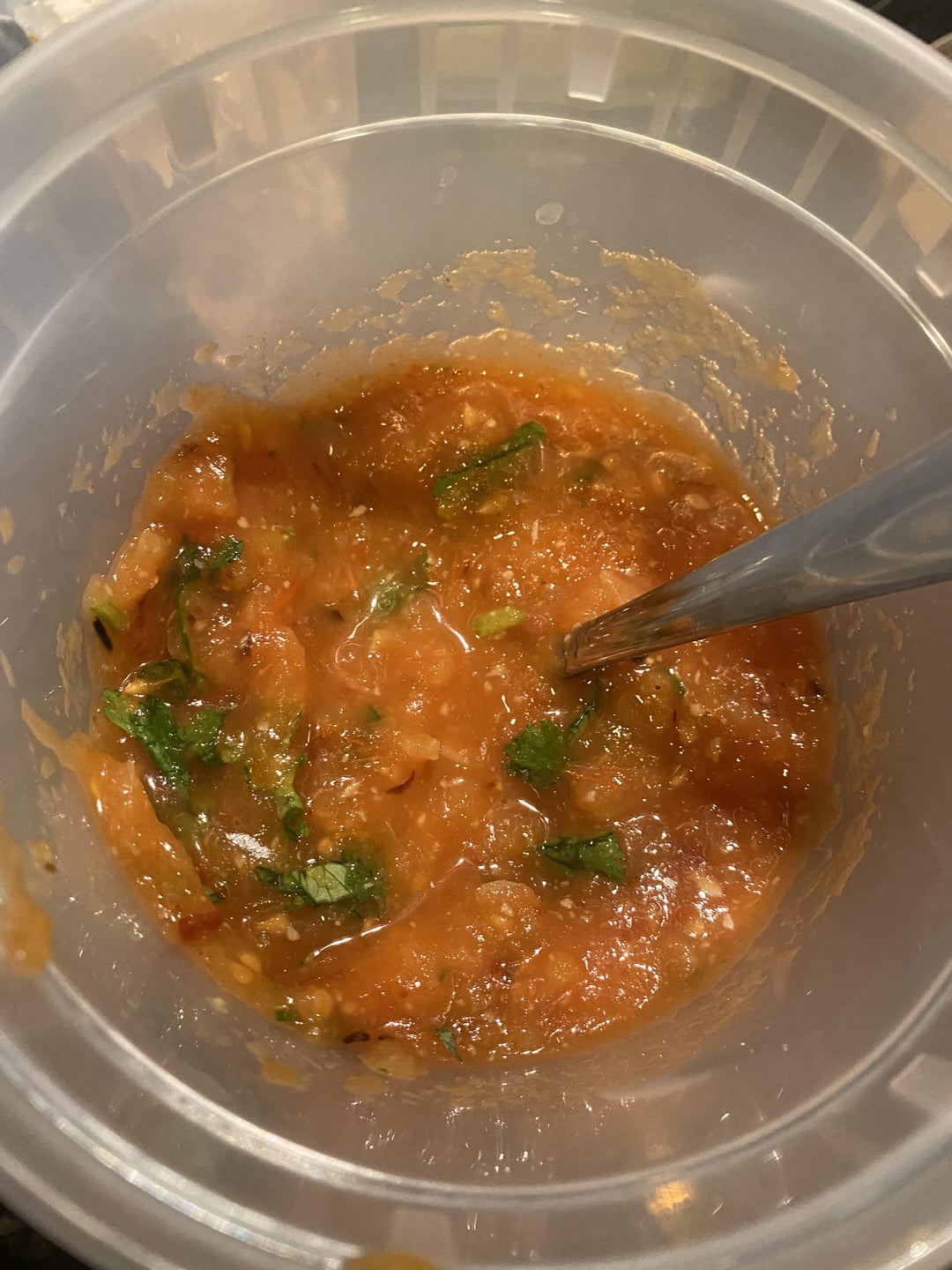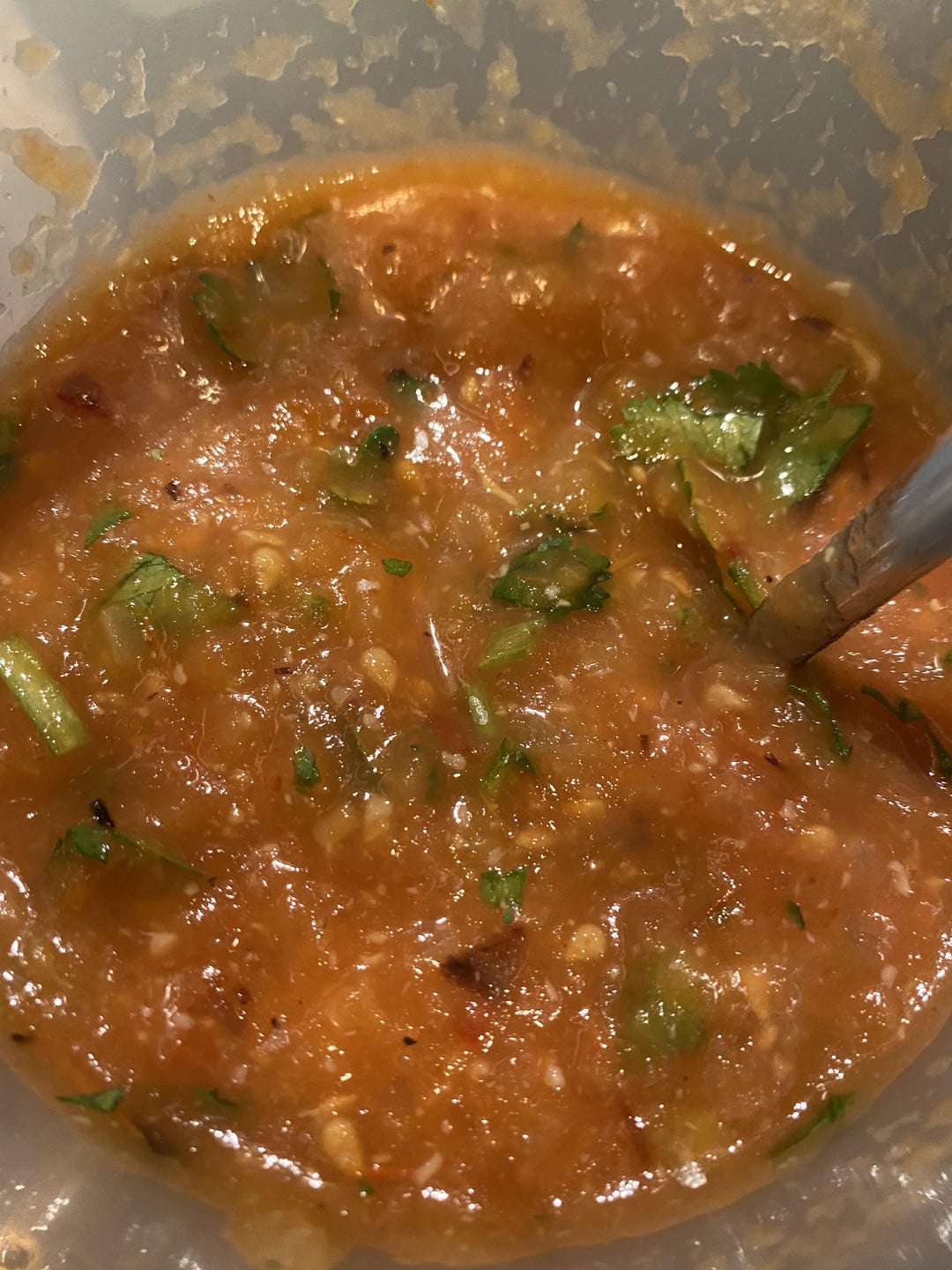 Sorry for no ingredient photos. Cilantro should’ve been chopped and blended for longer, but it was getting late- and I don’t actually mind having the bigger pieces in there! Tomatoes were what I had on hand. Curious how adding serranos would change the flavor profile: