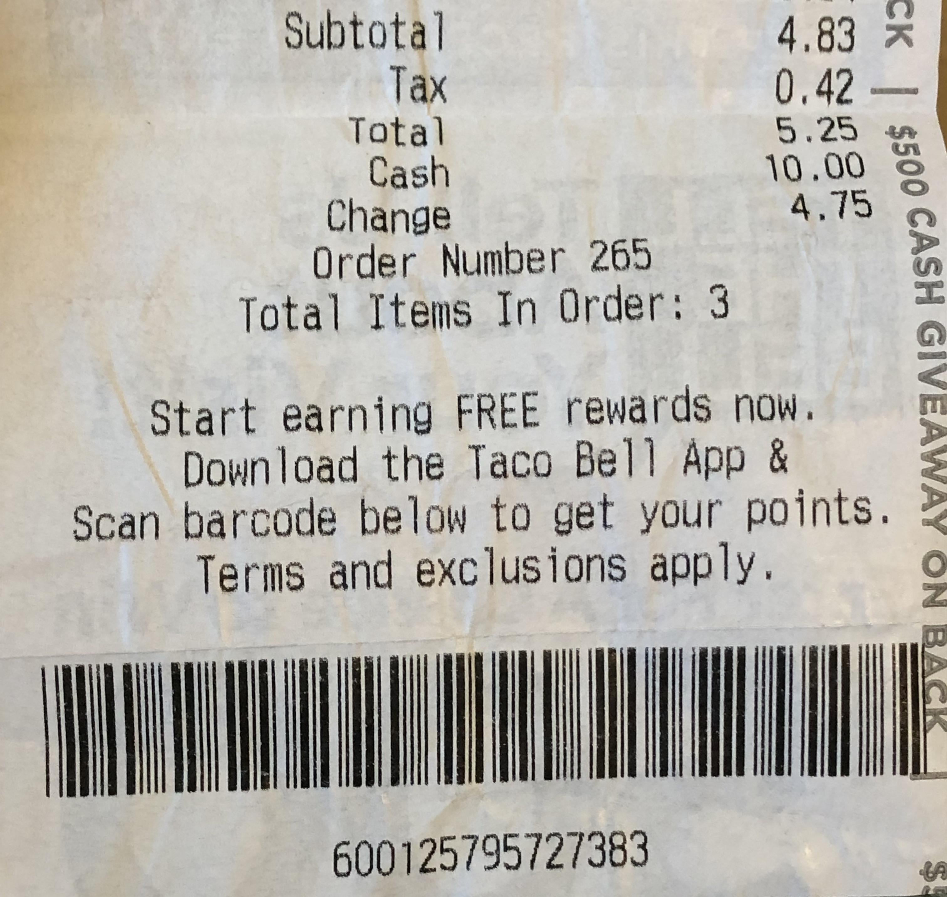 Here is a receipt from yesterday for some free points by jqwdvqsibqwiw taco bellWrite A CommentYou must be logged in to post a comment.