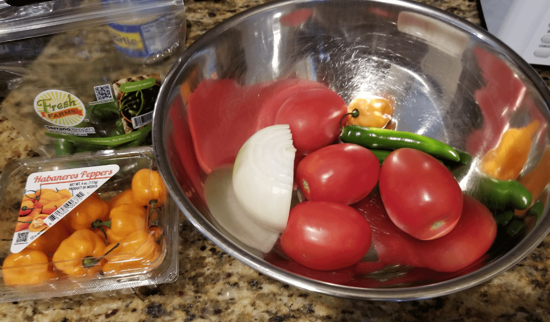 Habanero peppers, serrano peppers, Roma tomatoes, yellow onion, garlic, cilantro