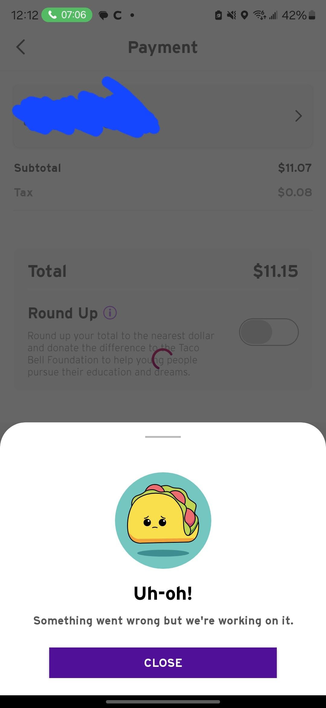 The past 4 days everytime I try ordering I get this. Order doesn’t go through but it still charges my card. Saw a bunch of people complain about it yesterday and support said it was fixed. Tried again last night and it worked, only for it to not work again this afternoon. Think I’m done with Taco Bell for awhile this is getting really annoying. Everything was fine until they sent out and update last week.
