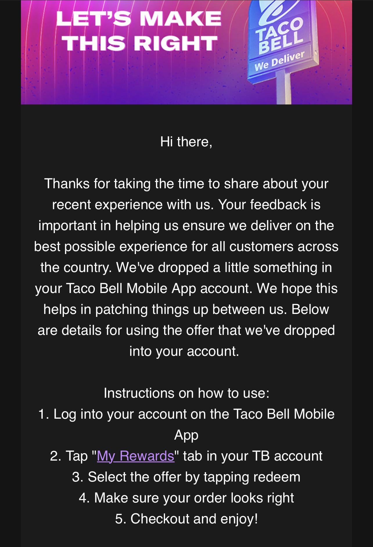 After sending in a complaint about a missing item, I was sent this email. But no reward shows up in my app. Has this happened to anyone else?by Derp98 taco bellWrite A CommentYou must be logged in to post a comment.