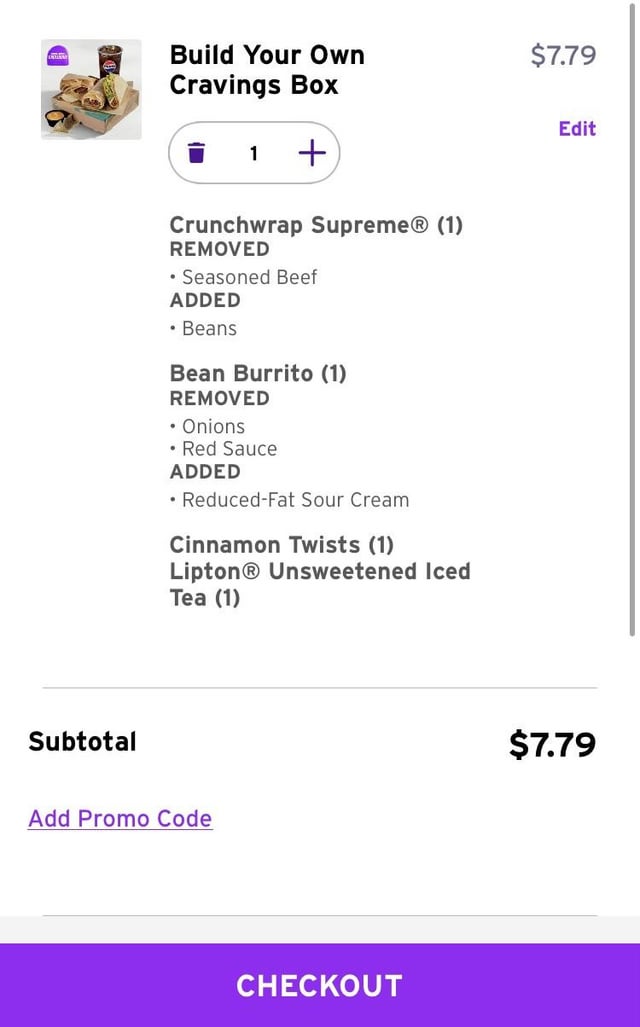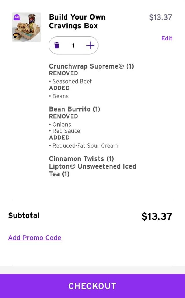 Hoping this is some kind of glitch or something, but yeah. I live in a really dense city, so there are an absolute ton of T. Bells around me. Somehow, when I logged in to order, I noticed that not only was the Veggie Cravings Box not available at my usual location, but the substitute I made for it was way more expensive than usual – literally over a 70% markup.