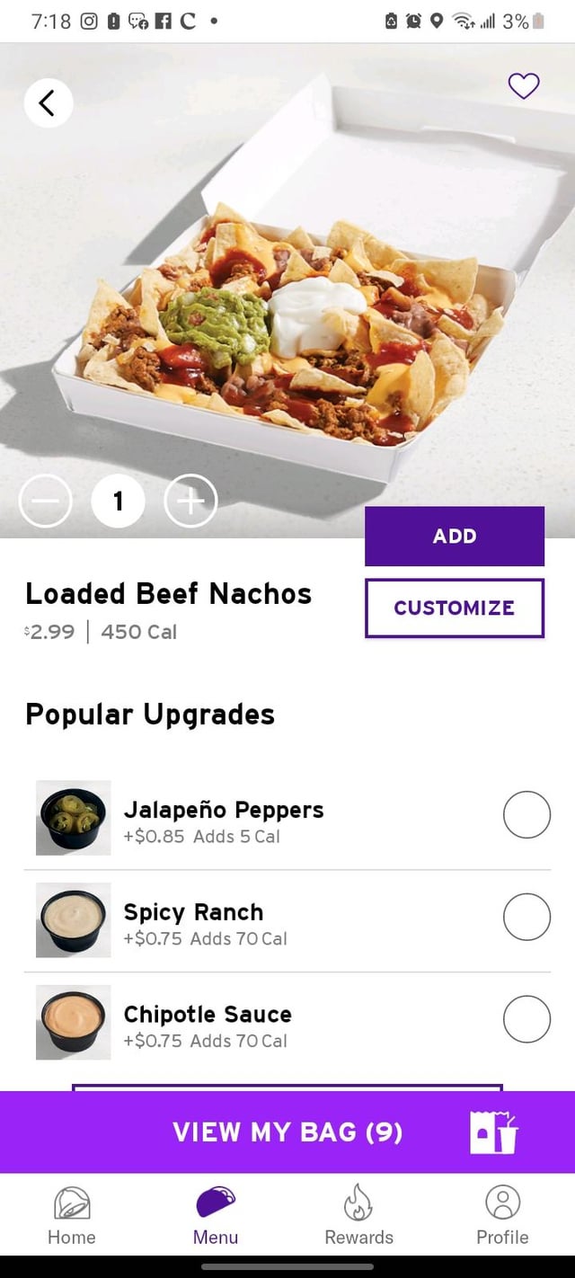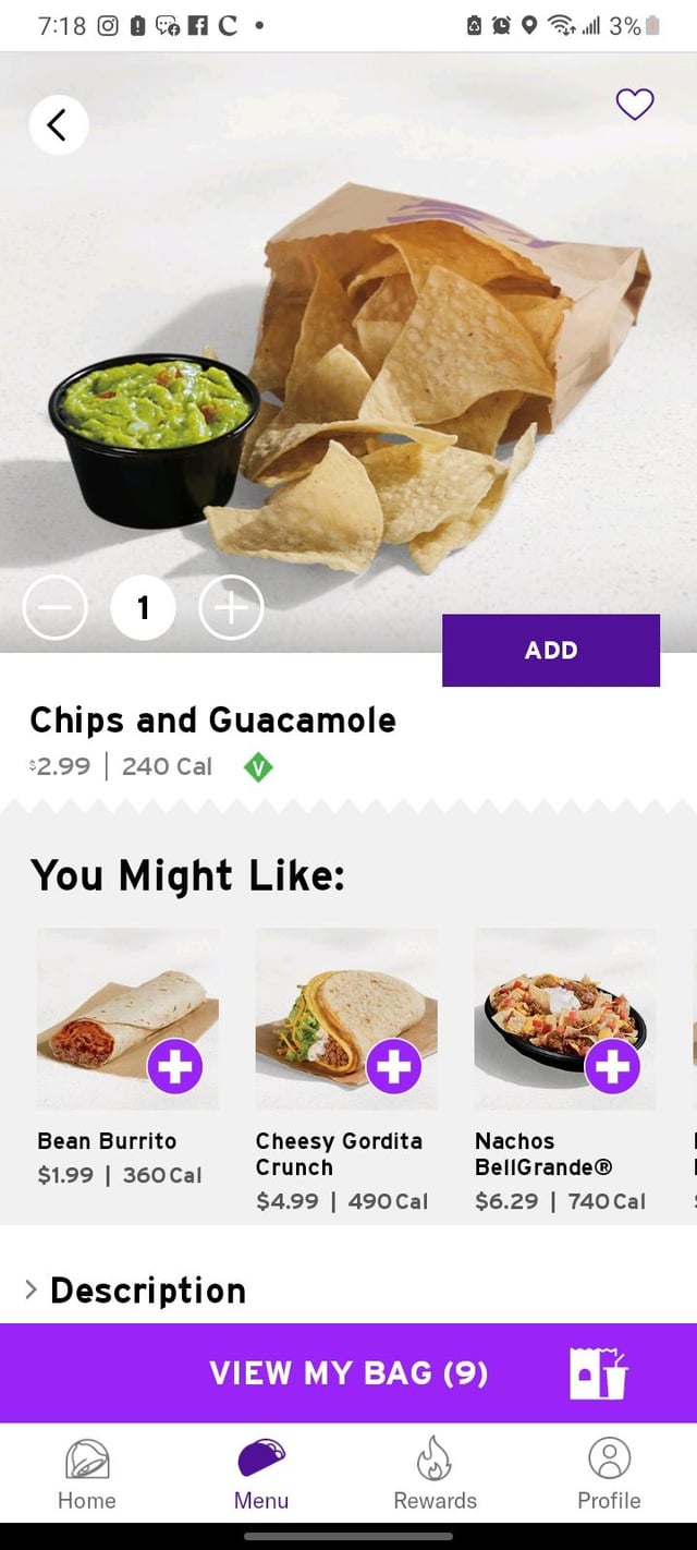 For 2.99 I can either get the loaded beef nachos that come with beef, beans, nacho cheese, red sauce sour cream, AND GUAC…. Or I can get just chips and guacamole for the same price and almost half the calories. by rumtumhugger taco bellWrite A CommentYou must be logged in to post a comment.