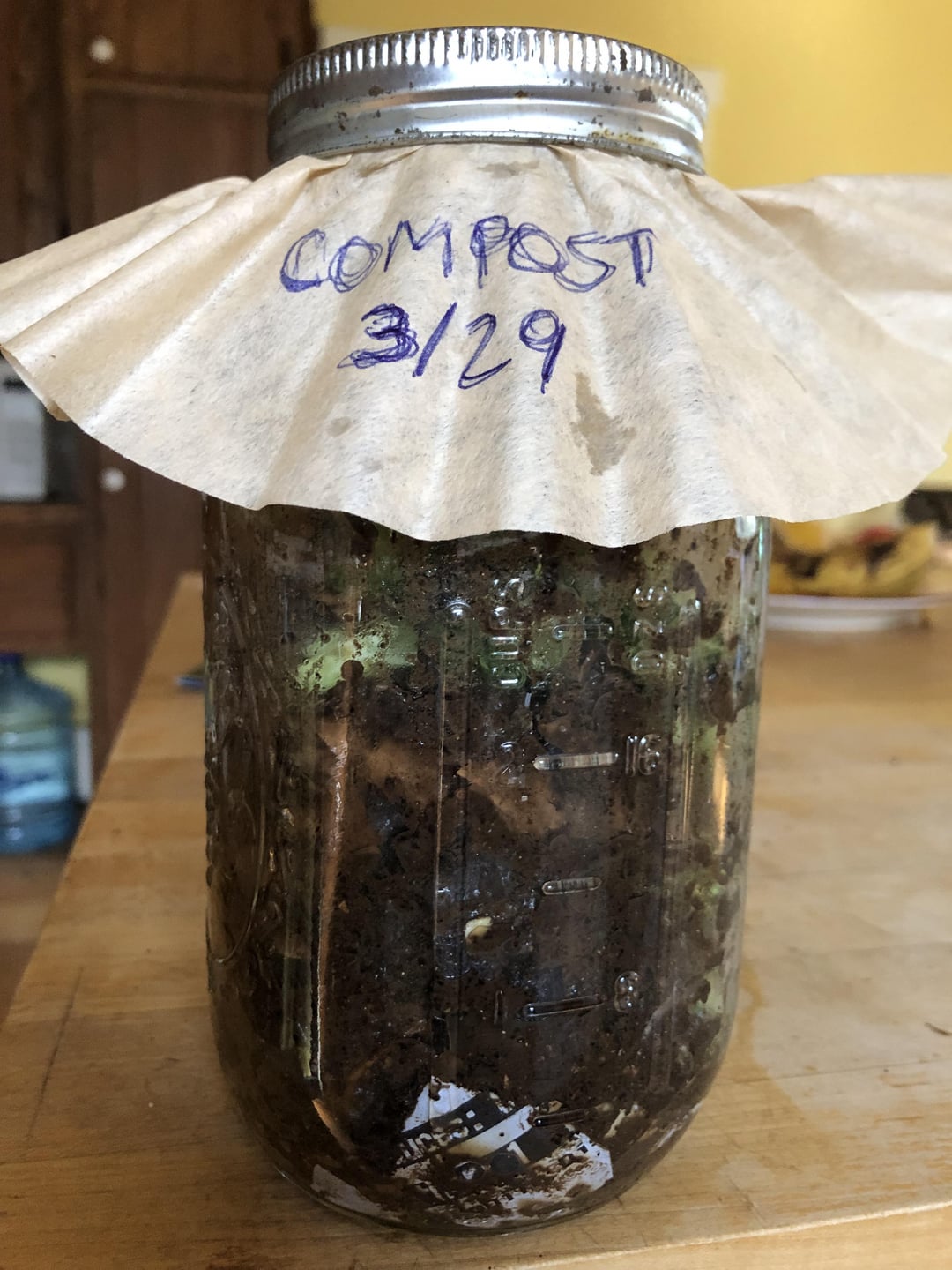 When you compost things you need oxygen but you have a lid on it. You also need drainage and ventilation and the jar is too small so this experiment of yours isn’t gonna work.