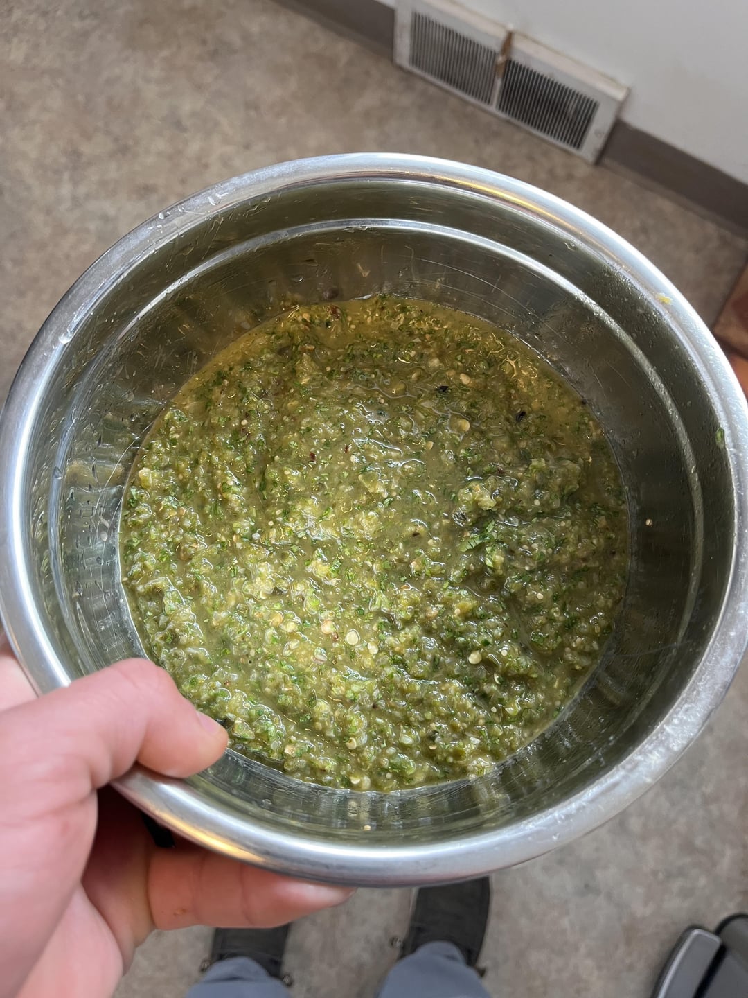 Regular had tomatoes, red onion, jalapeños, garlic, cilantro, and lime juice. Verse had tomatillos, white onion, garlic, jalapeños, poblanos, cilantro, lime juice. Pretty happy with the results!