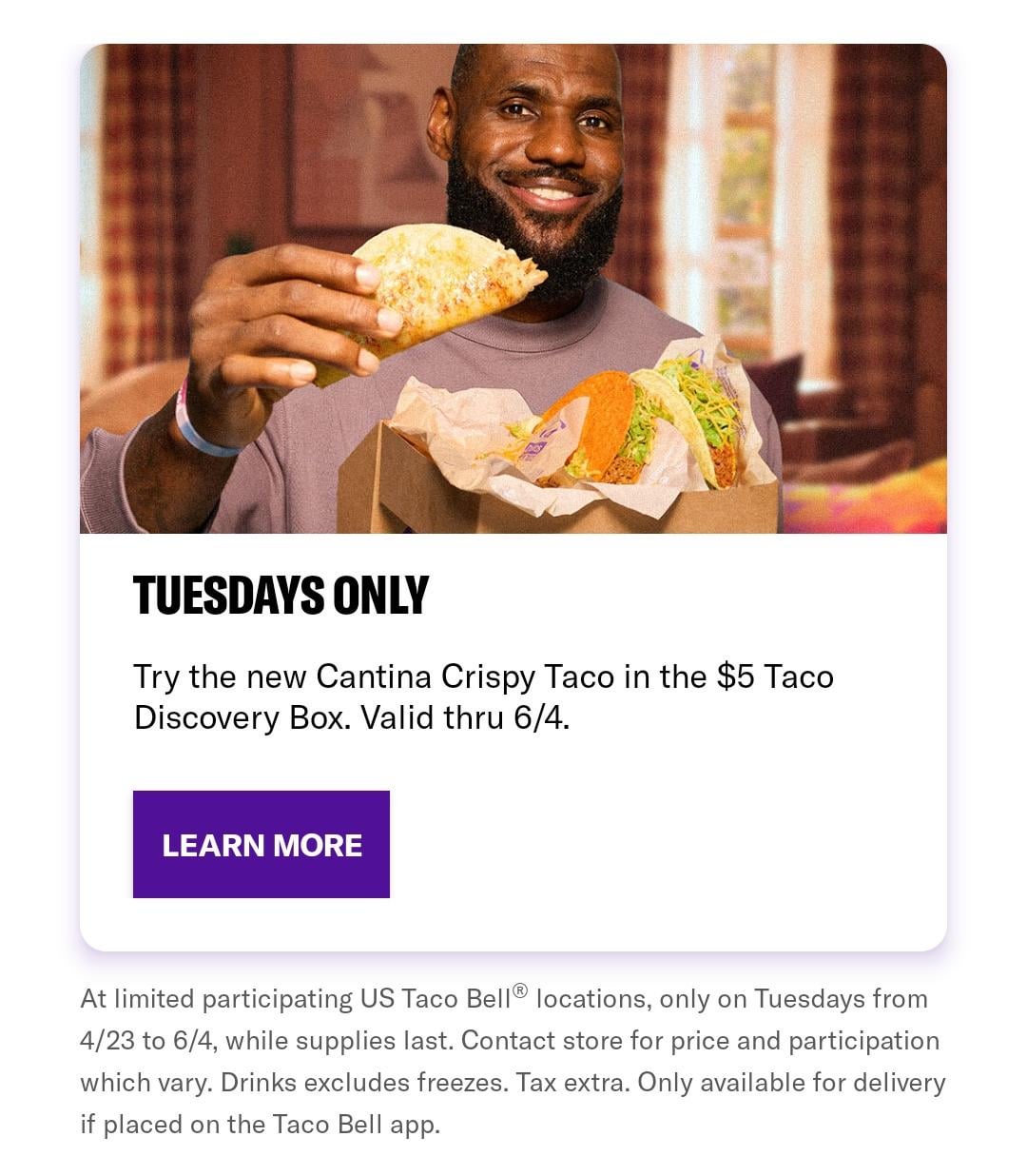 Stop booking celebrities for your ads and commercials! You're making the price of your food skyrocket for no reason! I'm not more inclined to eat a freaking taco just because Lebron James is holding it or because that weird guy that dated Kim Kardashian is in the commercials. I'm pretty sure they're charging lots of money to show their face and that's only made worse the issue with the quality of your food for example, what used to be an awesome value, the crunchwrap.