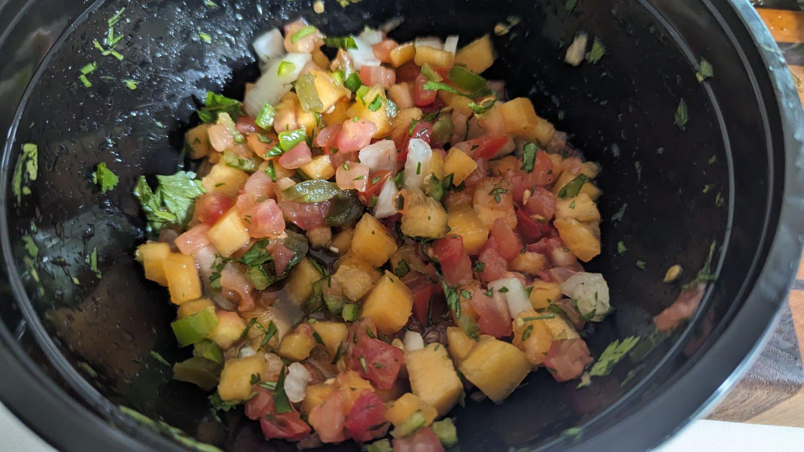 Wife was cutting up some cantaloupe. I took a couple wedges, diced it up into 1/4-1/2in pieces about 2 cups worth. Diced up some tomato, onion, Serrano, cilantro and a little salt to taste.