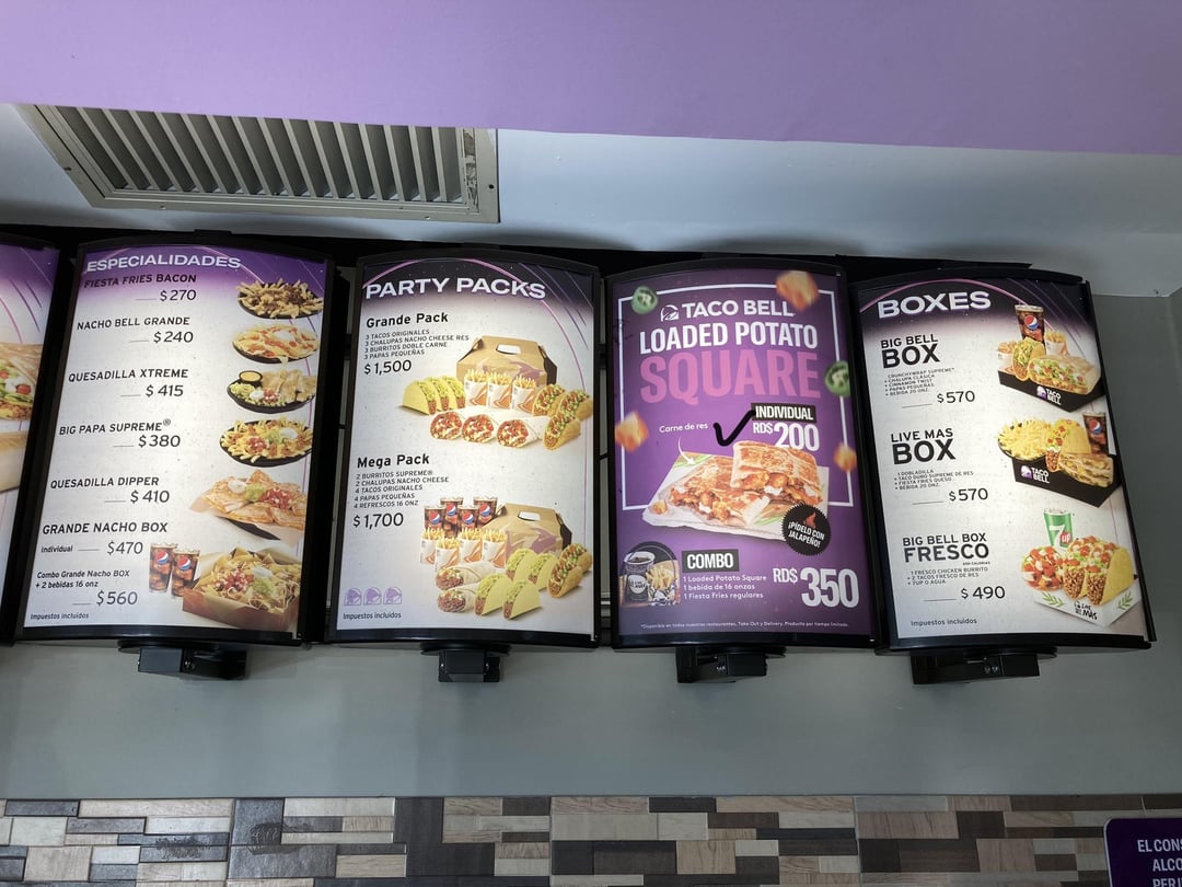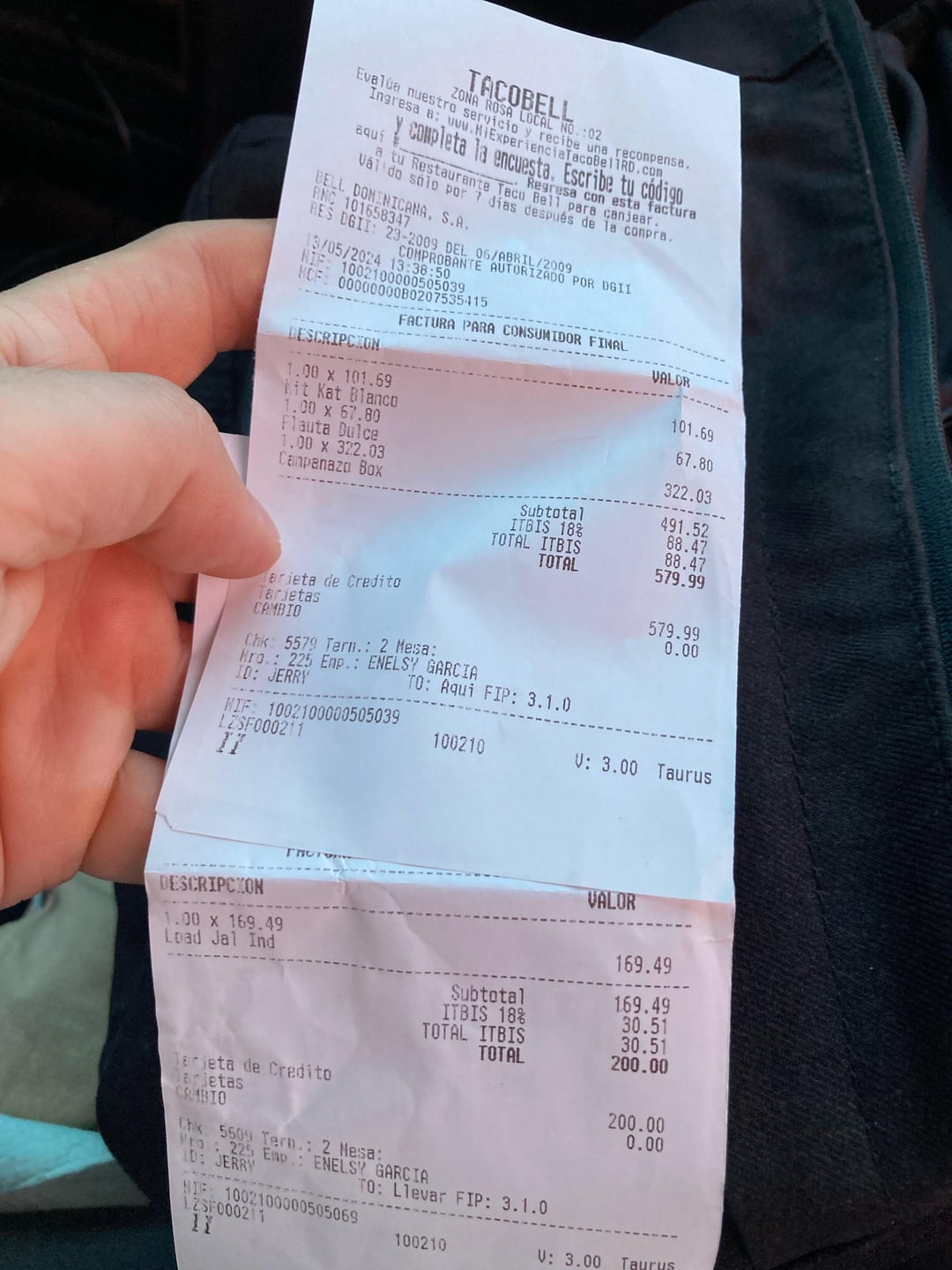 I posted earlier about the DR menu. I finally went back to try some of the ones that I thought was interesting. I got the loaded potato square which was my favorite by far and the beef was generous with jalepenos, chocodilla kitkat blanco was really good surprisingly. Flauta dulce, not all that good but ok only and wouldnt get it again. The campanazo box, meximelt was amazing to me way more than the chicken and rice though chicken and rice was good too. The fries were crispy but nothing special compared to our fries of course. Total price was $13.38 according to my bank transactions. As much as I wanted a corona or Modelo I couldnt.