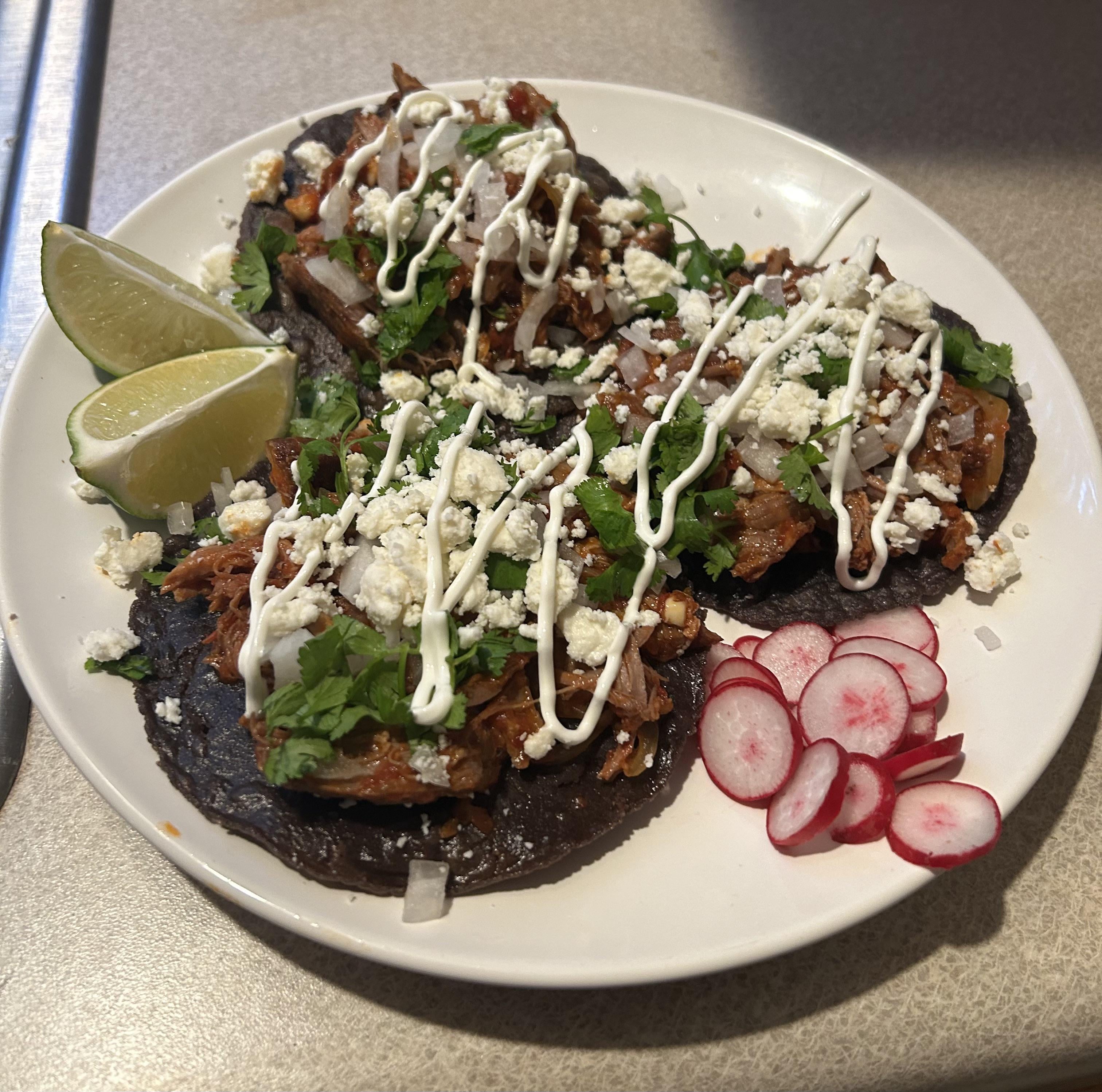Blue corn tostadas with pork tinga poblana