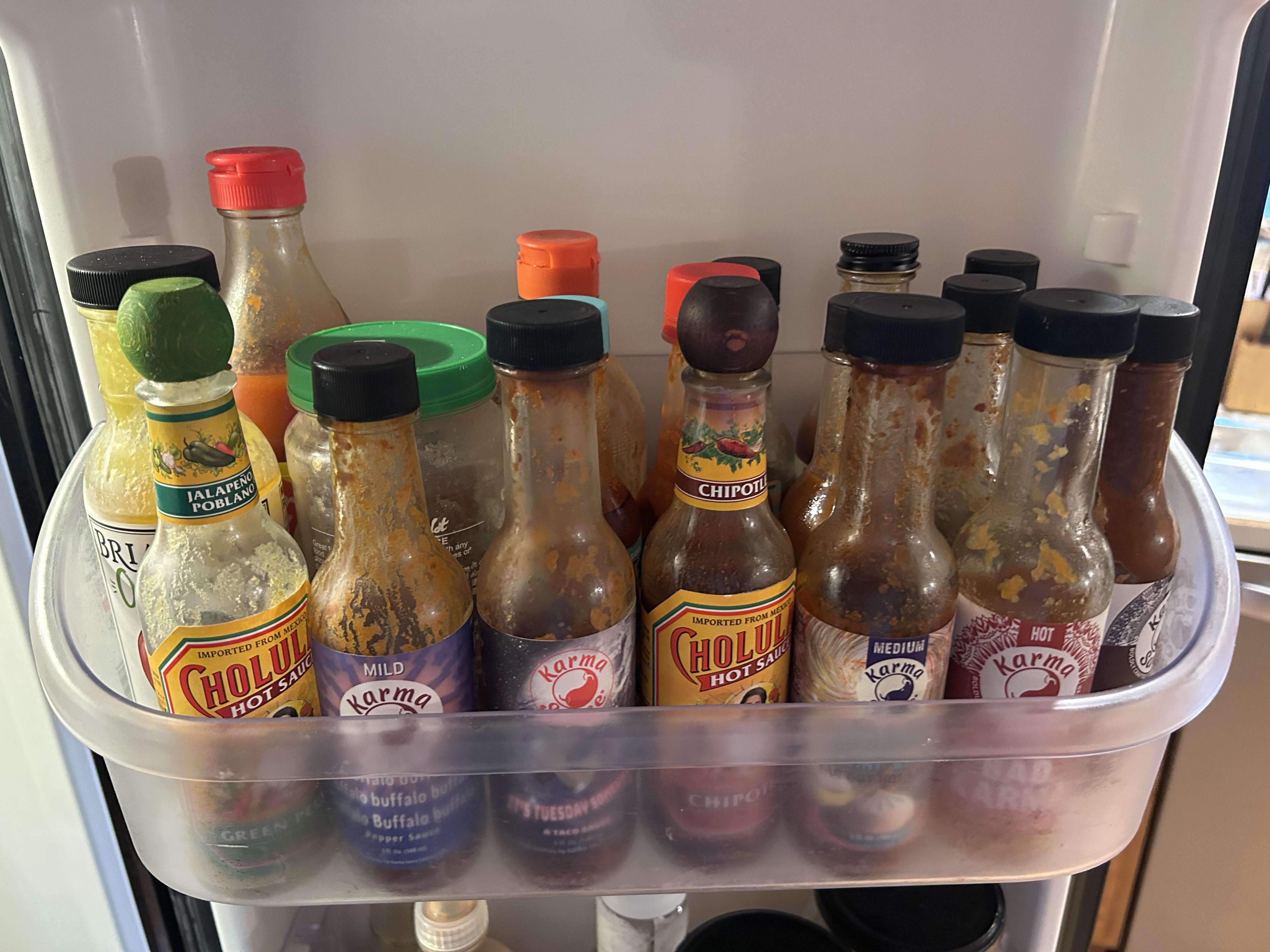 My daughter and son-in-law’s fridge shelf just for hot sauce!