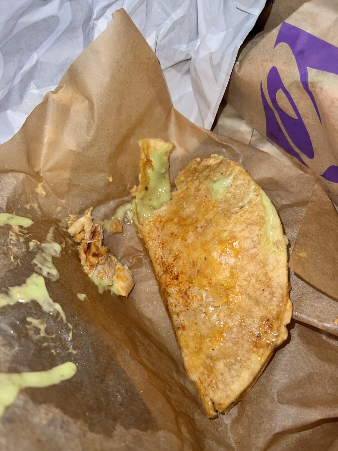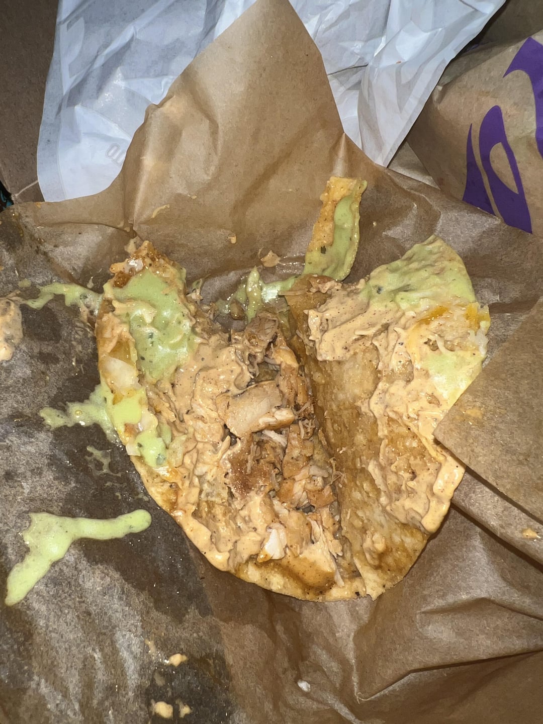 It absolutely was not 'crispy' and it fell apart like corn meal that was soaked in sadness. I tried the salsa to calm down the heat and didn't it help. There's so much sauce and not alot of meat, I cant really even avoid it and its a giant mess,is that the point?
