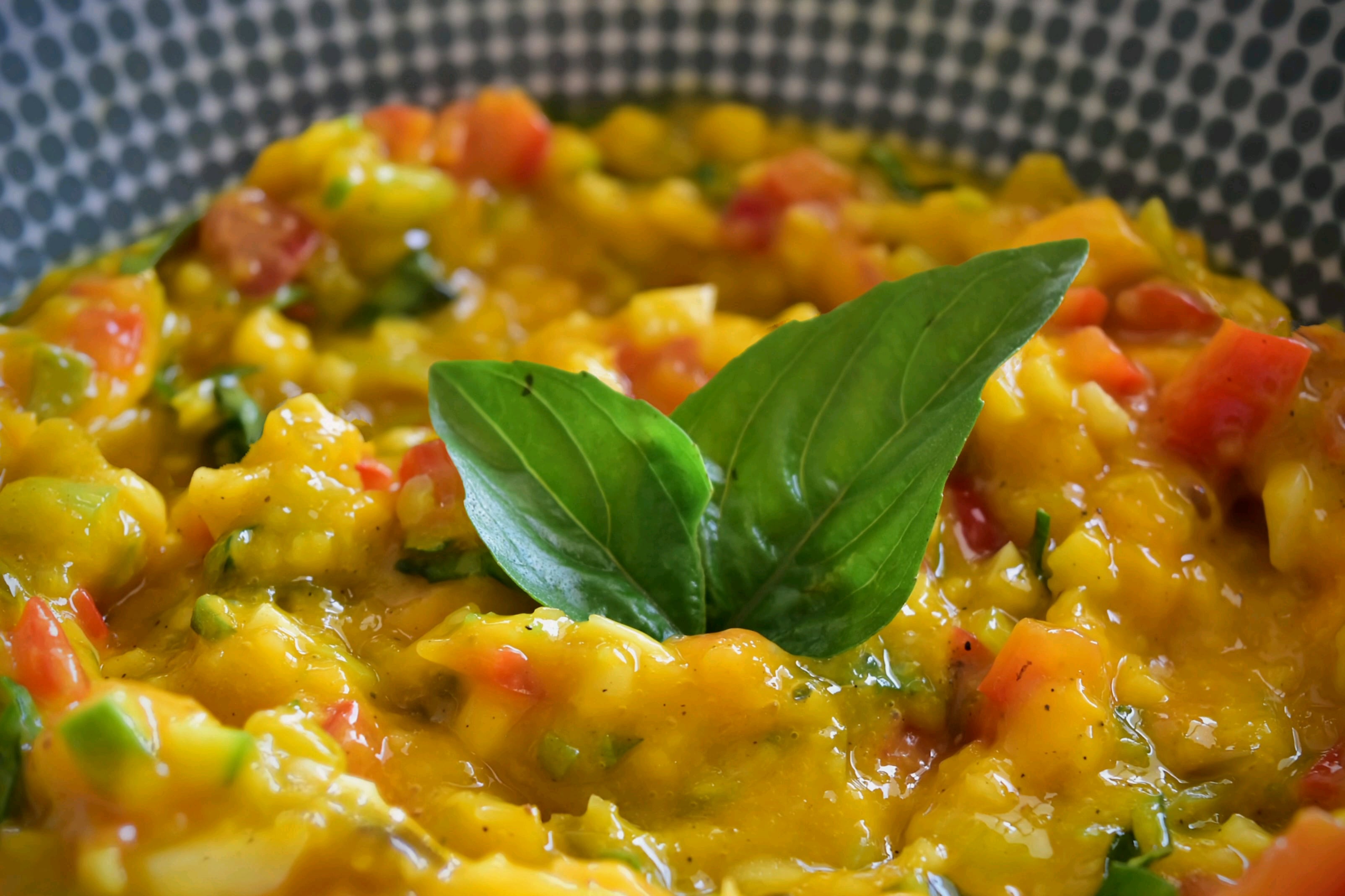 • Mix the diced mangoes, red bell pepper, red onion (if using), jalapeño pepper, and basil/cilantro.
