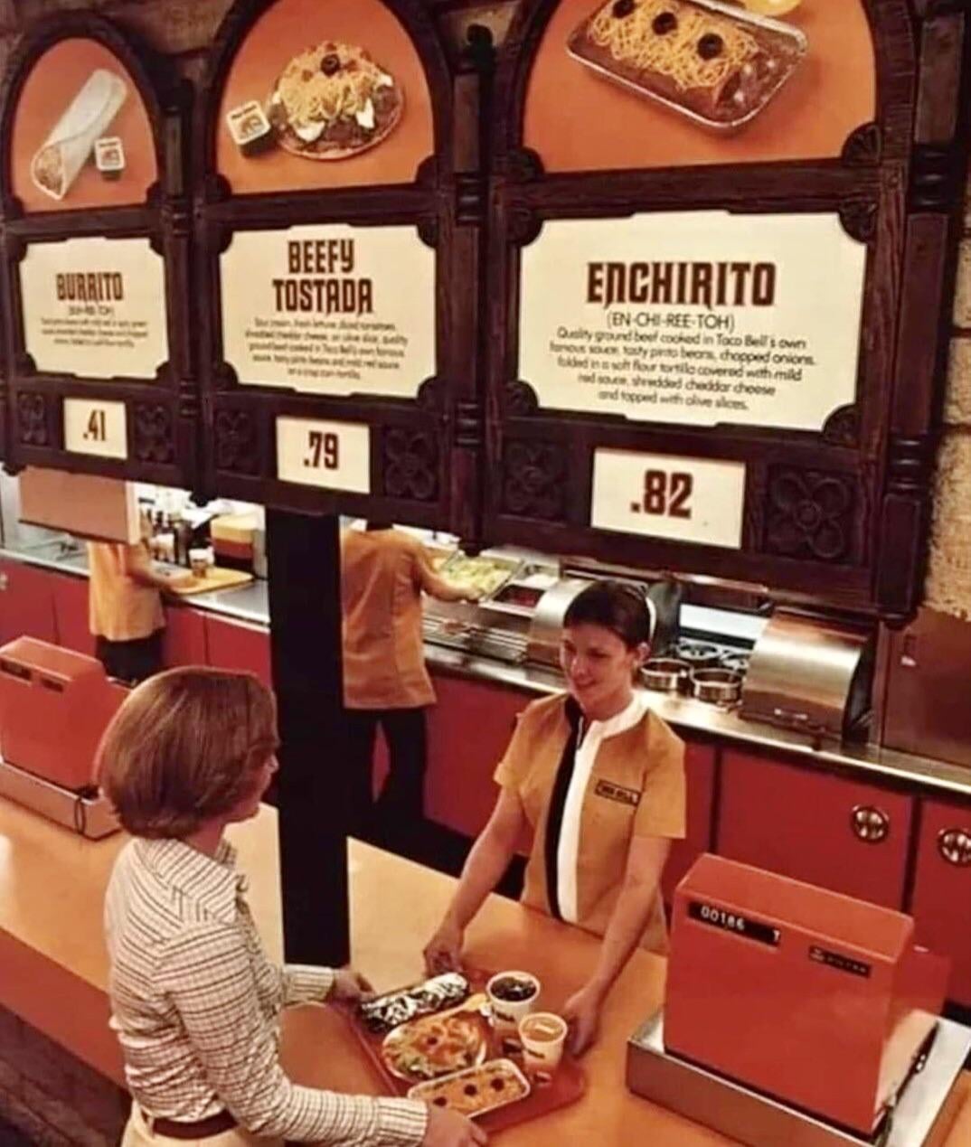 Still shot from a 1970s Taco Bell ad, complete with pronunciation guides