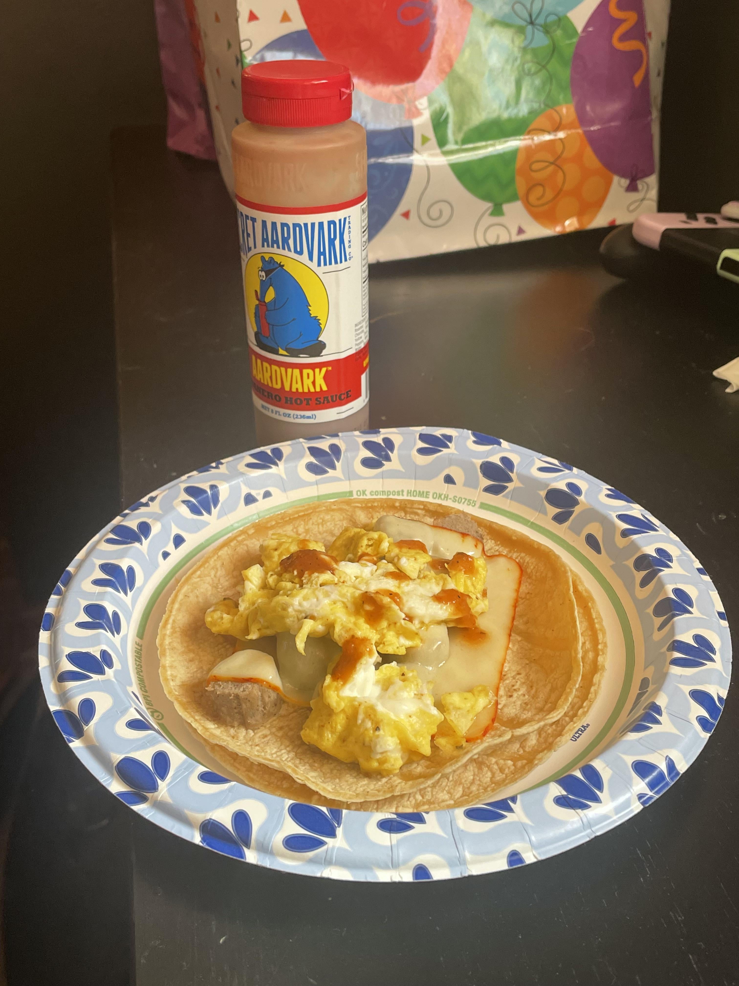 Couple Milagro tortillas from the Mexican grocery store, chopped turkey sausages, muenster cheese, and scrambled eggs seasoned with Traeger Breakfast Rub, a splash of Tabasco green, and some Secret Aardvark on top.