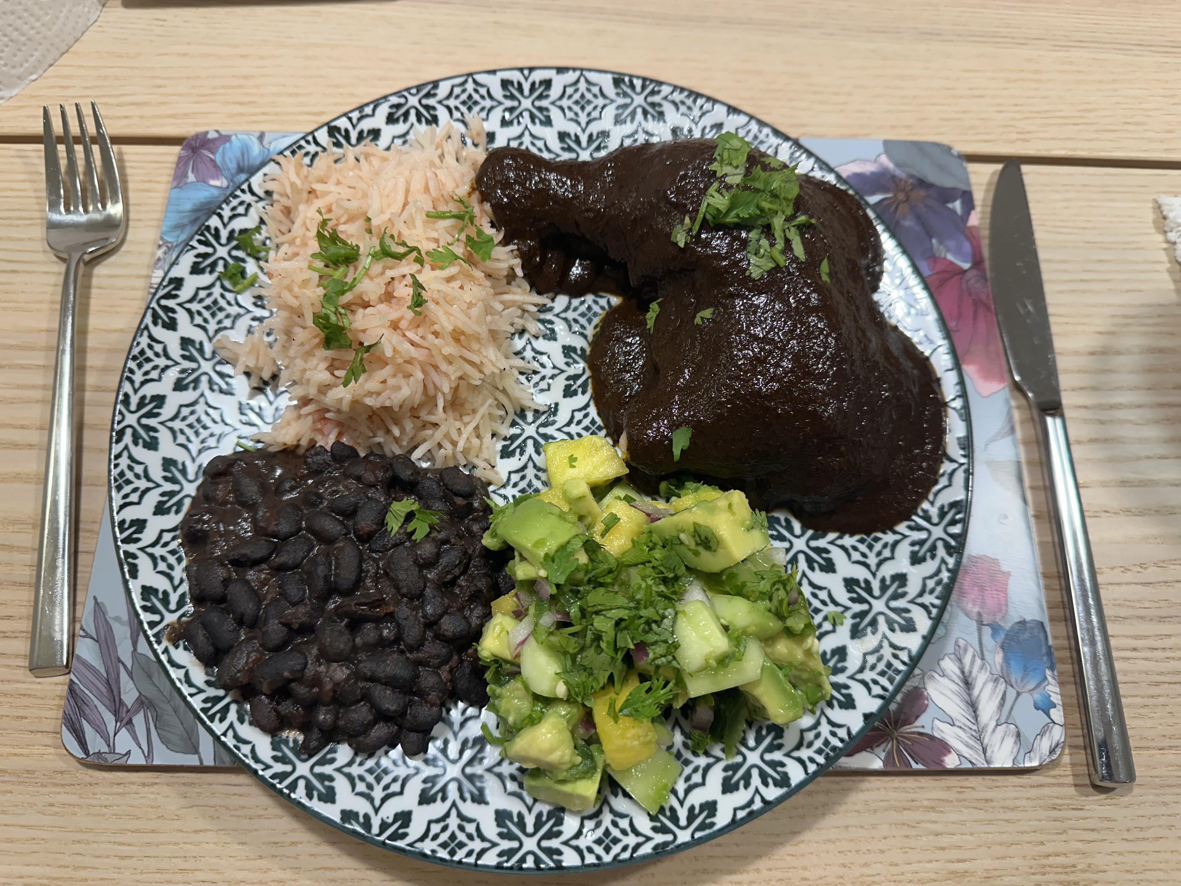 I clearly need to work on my food presentation and photography (I admit I was in a bit of a rush to sit down and eat!), but overall I was happy with the results. The mole negro, made a couple of days ago, was great – intense, complex and rich. I had to make a couple of adjustments – rich tea biscuits instead of Maria cookies, purple sweet potato instead of plantain, but otherwise as close to the recipe as possible (including in burning the chilhuacle negro, mulato and pasilla peppers – something which went against all my cooking instincts but turned out really well).