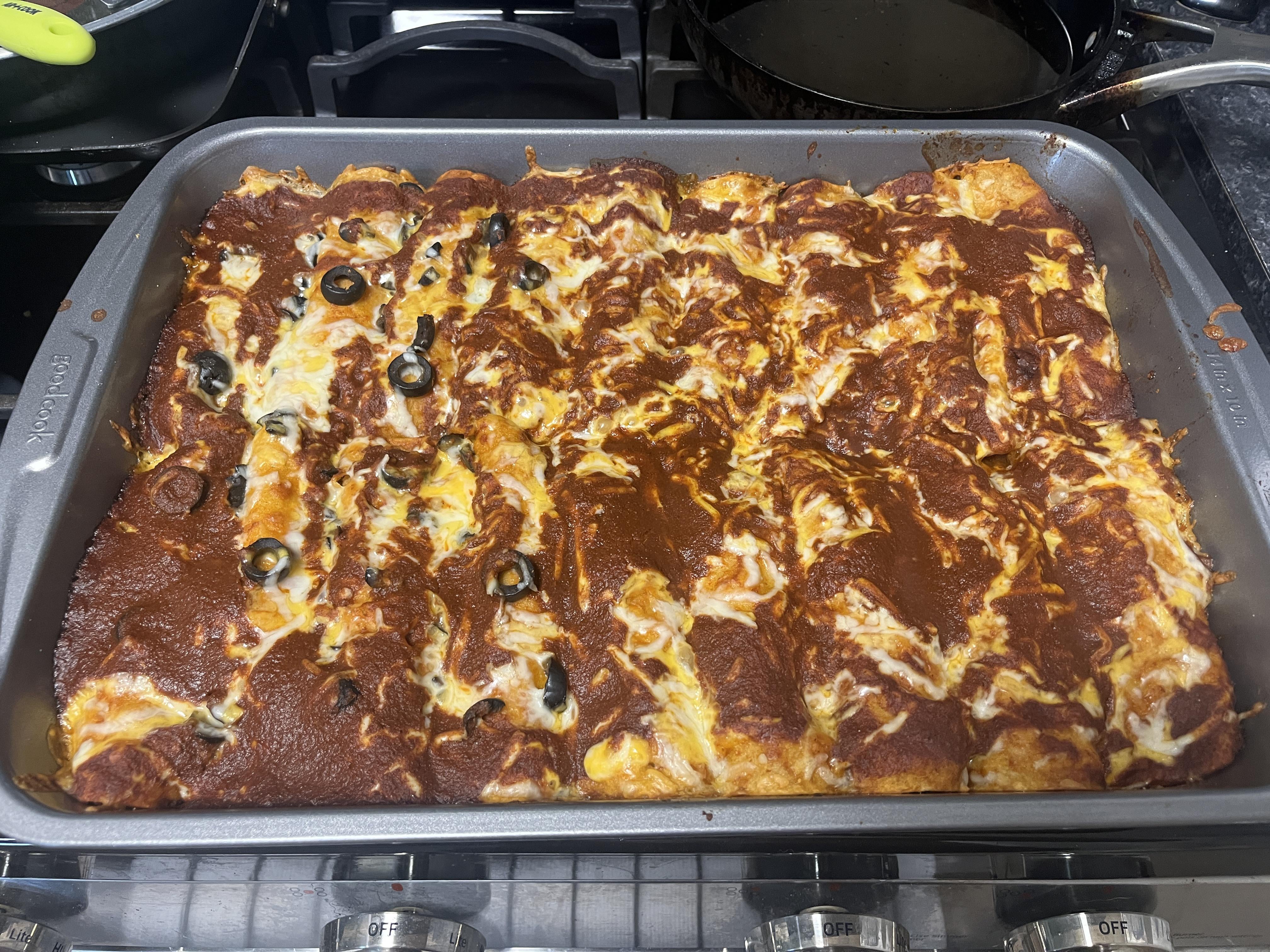 Red chicken enchiladas with half black olives on top. And plenty of cheese!!! by SuddenSpeaker1141 Write A CommentYou must be logged in to post a comment.