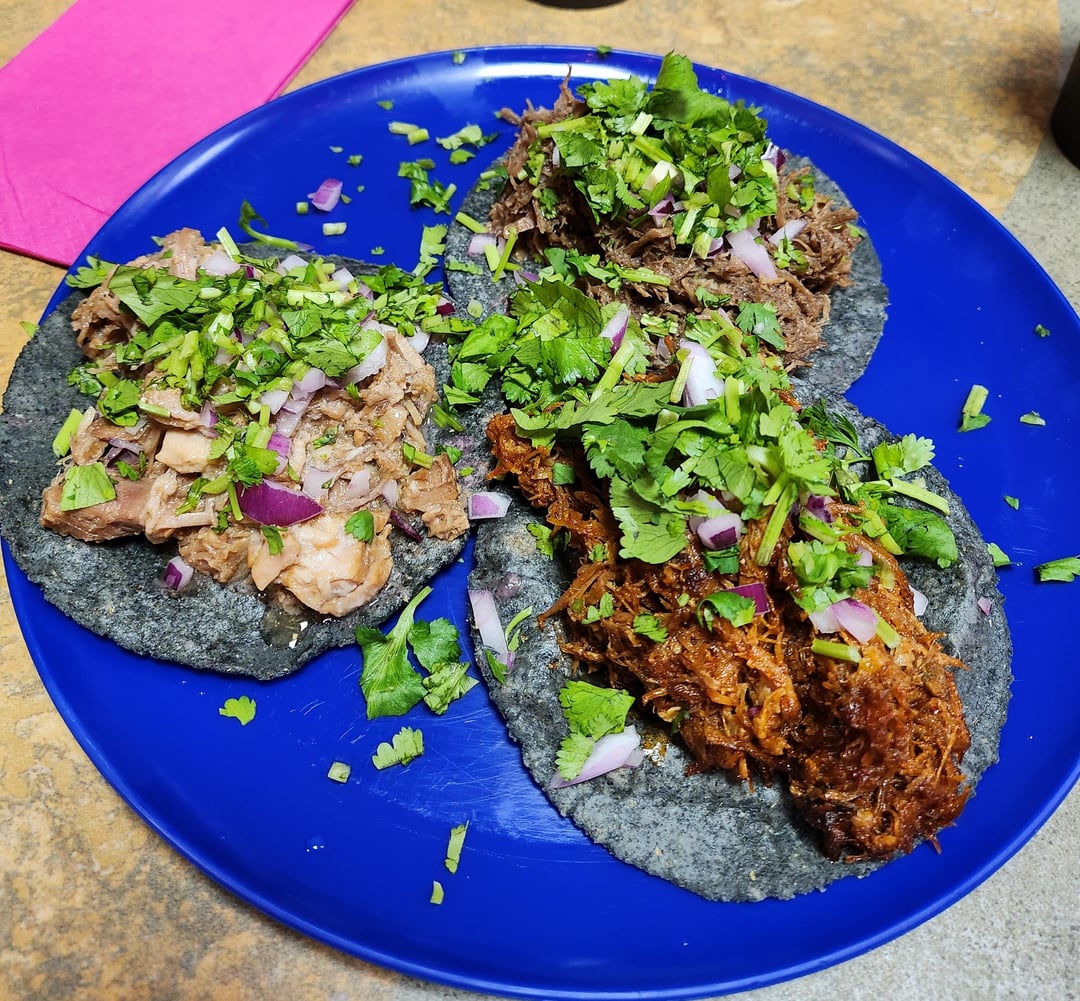 First pic clockwise from the left: carnitas, suadero beef, and spicy pork chicharron.
