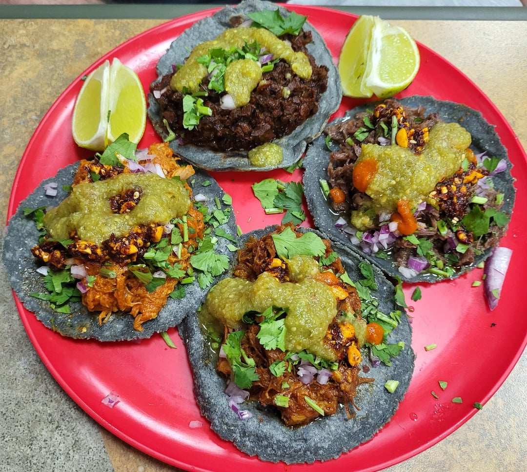 Third pic clockwise from left: chicken encacahuatado, vegan chicharron mushrooms, suadero beef and spicy pork chicharron.